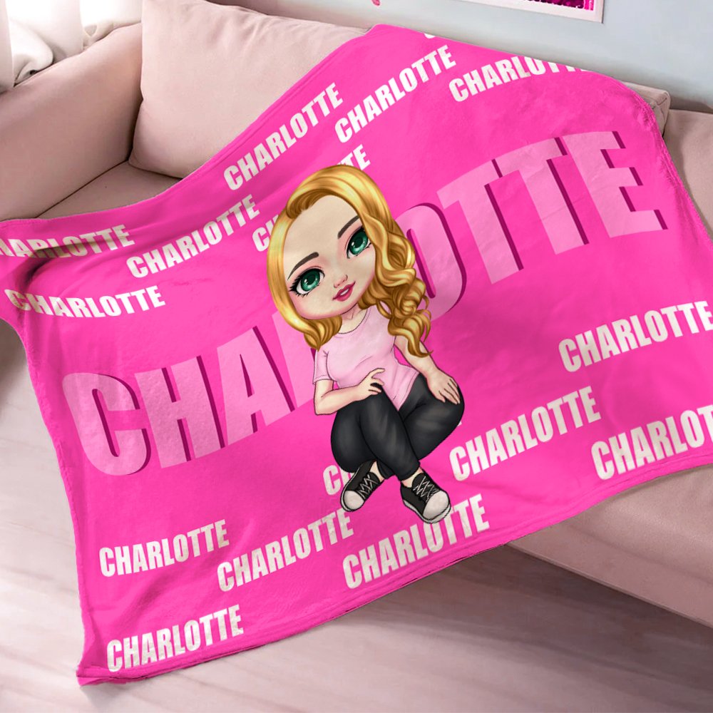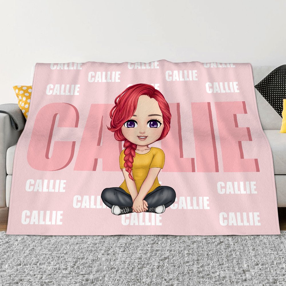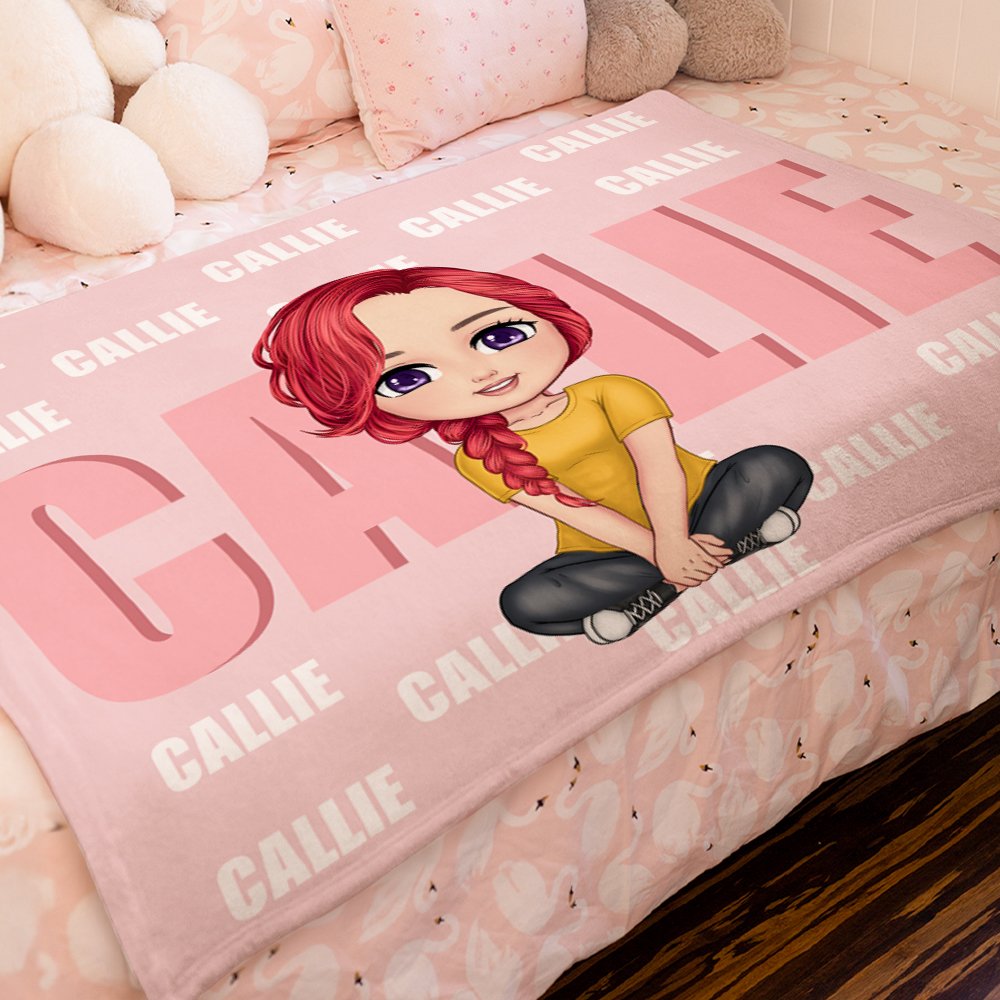Deze zachte deken heeft schattige stripfiguren en is verkrijgbaar in 25 kleuren. Het kan worden gepersonaliseerd met namen en is aantrekkelijk voor meisjes, jongens en volwassenen.