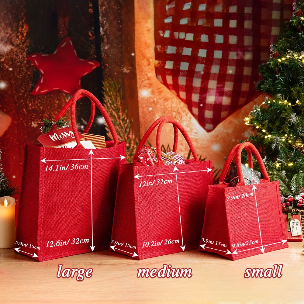Deze jutezak is gemaakt van natuurlijk jutemateriaal van hoge kwaliteit. De textuur is dik en duurzaam en is bestand tegen slijtage door dagelijks gebruik. Jute is niet alleen milieuvriendelijk, maar heeft ook een sterk ademend vermogen en scheurvastheid, zodat de tas niet snel beschadigd raakt, zelfs niet als hij vol cadeaus zit. De kleur van de tas is klassiek kerstrood, dat fijn verwerkt is en niet gemakkelijk vervaagt of vervormt, zodat de tas lang meegaat.