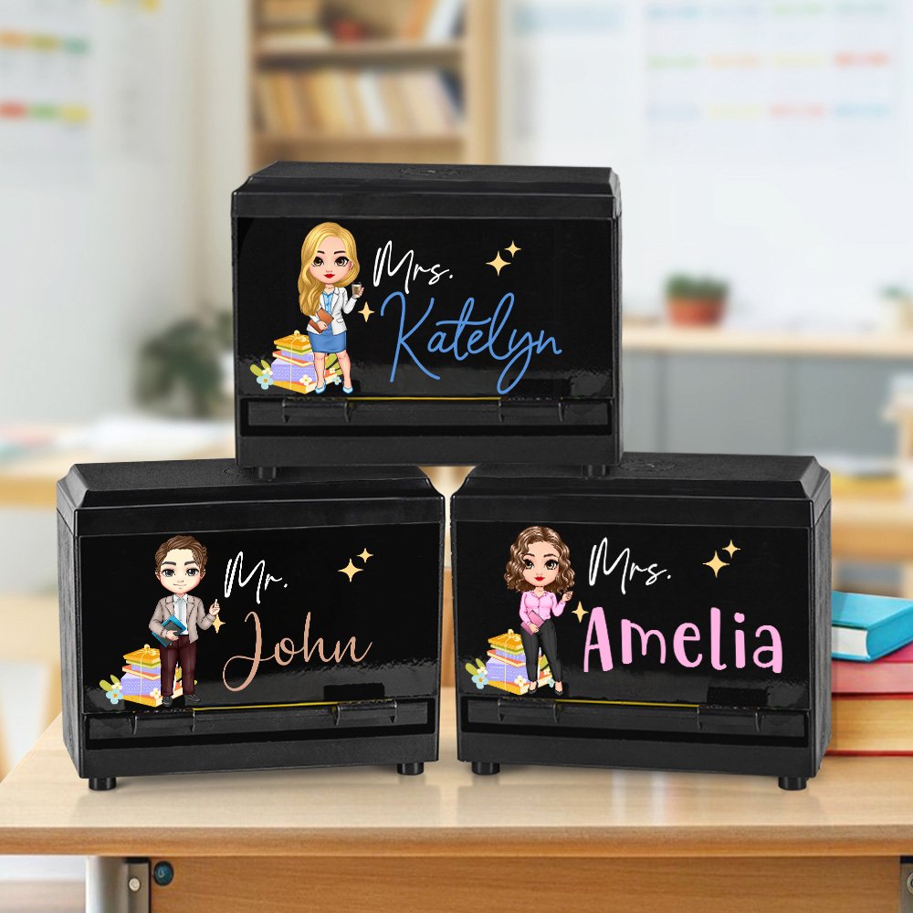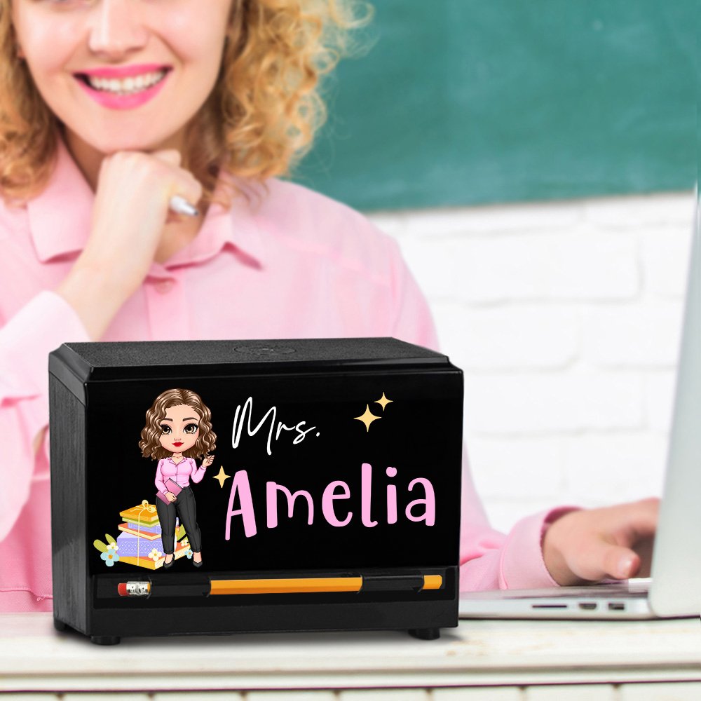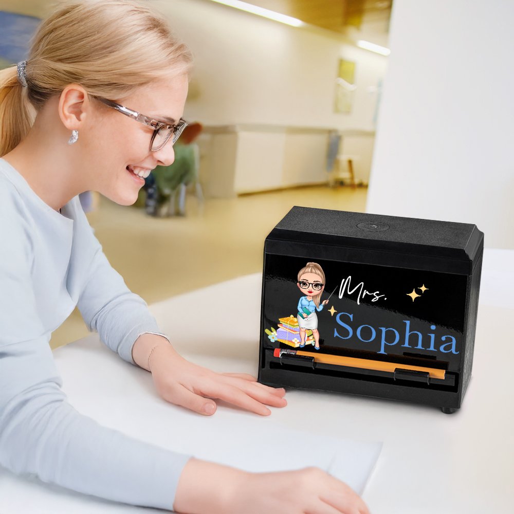 Deze leuke potlooddispenser heeft een schattig ontwerp van een cartooneske leraar en biedt aanpassingsopties voor verschillende geslachten en leeftijden. Pas je cartoonafbeelding aan voor de leraar en voeg je achternaam toe om een speels tintje toe te voegen aan elke werkplek!