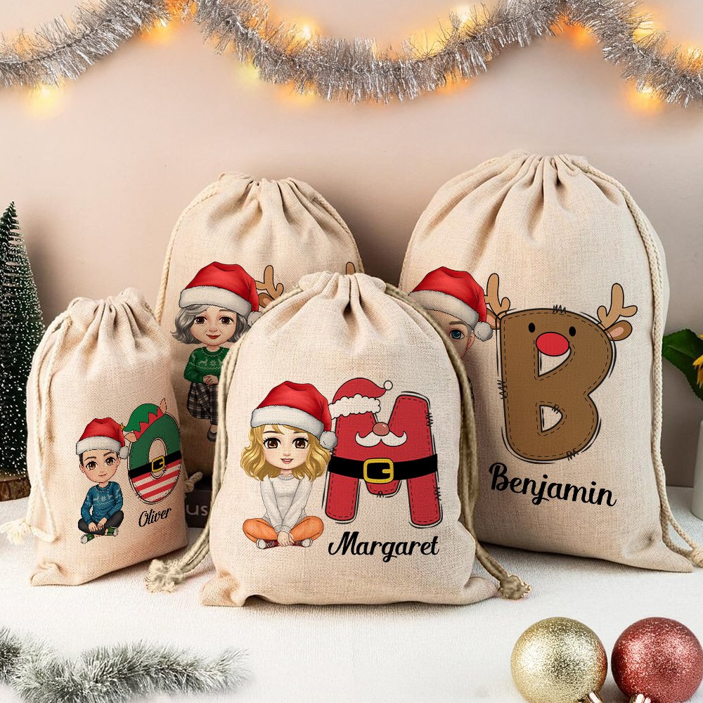 Deze geschenktas heeft 4 kerststijlen: sneeuwpop, rendier, kerstelf en kerstman. Je kunt de beginletter van je favoriete stijl kiezen en een stripfiguur aanpassen van haarkleur tot outfit en een naam om deze geschenktas persoonlijk, levendig en interessant te maken, vol kerstkleuren.