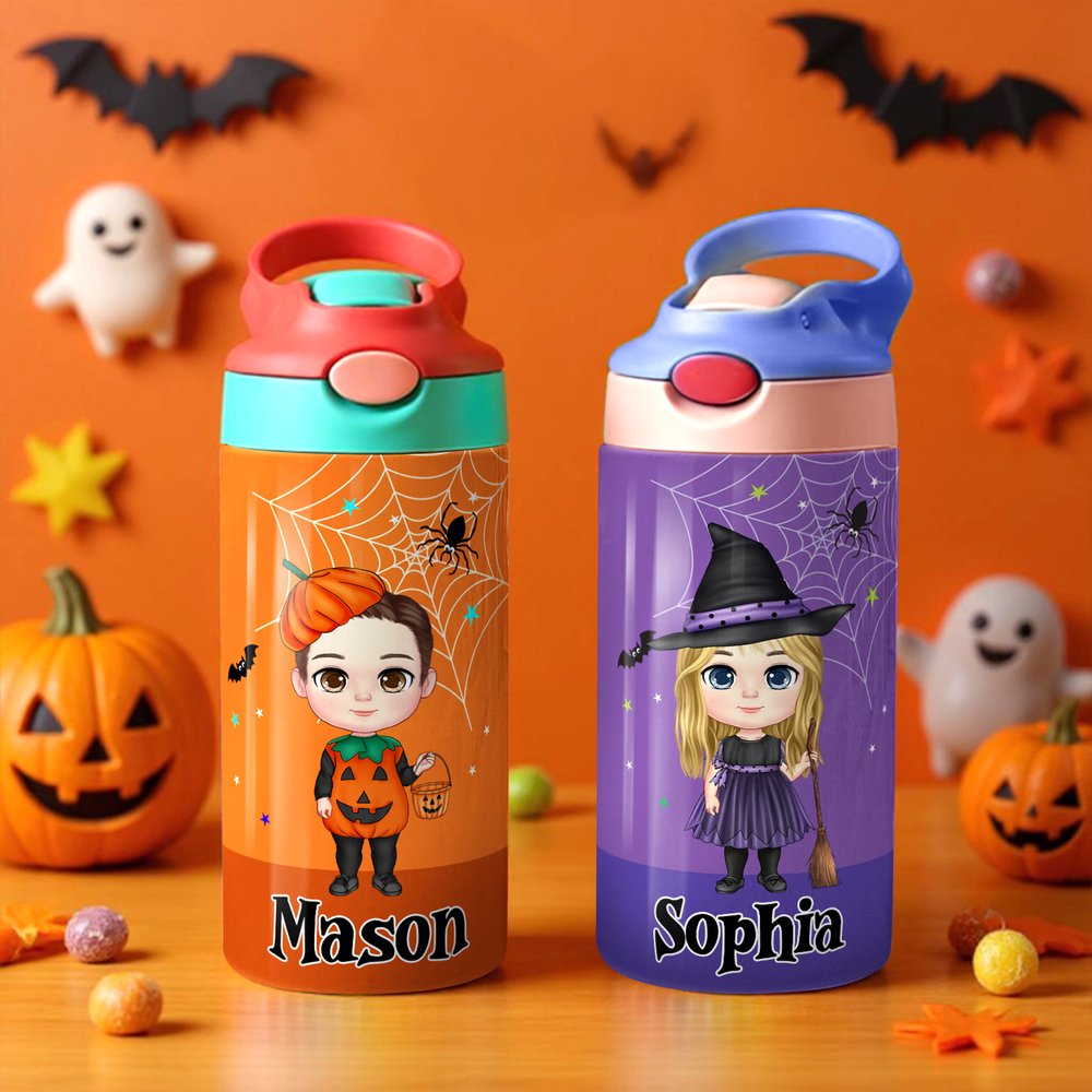 Deze geïsoleerde waterfles voor kinderen heeft een Halloween-thema met leuke stripfiguren en klassieke Halloween-elementen zoals heksen, vampiers en pompoenen. Het creëert een vrolijke, feestelijke sfeer. Je kunt het ontwerp van het personage aanpassen en de naam van je kind toevoegen, waardoor elke fles uniek is en het perfecte accessoire voor hun Halloween-feestjes.