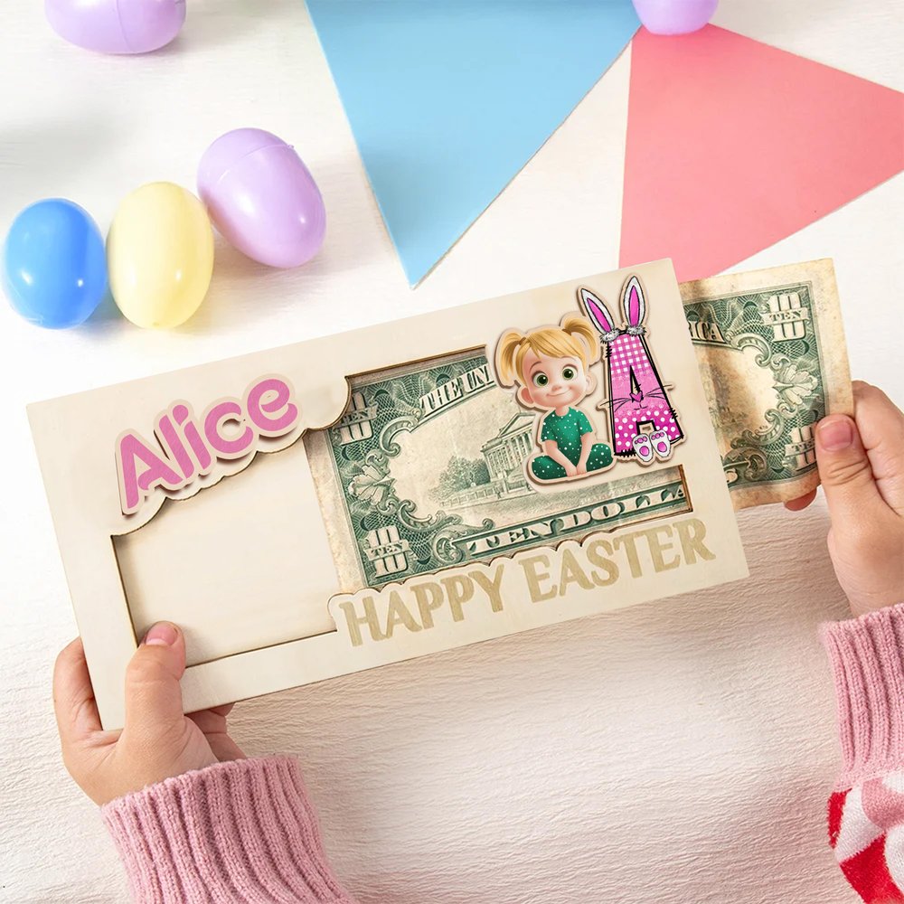 Deze unieke paashouder heeft volledig aanpasbare details: je kunt een persoonlijke naam toevoegen in levendige, gekleurde letters, gecombineerd met een eigen stripfiguurtje dat past bij de stijl van het kind en een initiaal met konijntjesthema. Dankzij het ontwerp met gleuven kunnen contant geld en cheques gemakkelijk tussen twee houten panelen worden geschoven, waardoor een praktische geldhouder een speels, persoonlijk paascadeau wordt.