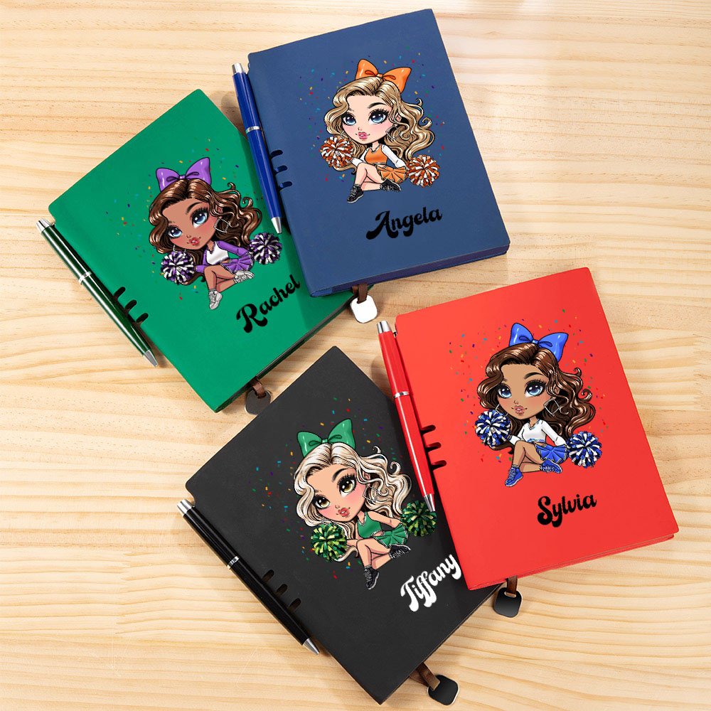 Dit notitieboekje is ontworpen met cheerleadermeisjes in gedachten. Cheerleadermeisjes hebben fel, golvend, lang haar en cheerleaderkostuums, die mooi en charmant zijn en hun vitaliteit en enthousiasme tonen. Je kunt je naam toevoegen om er een uniek souvenir van te maken. Je kunt kiezen uit vijf kleuren, elk voorzien van een pen in dezelfde kleur.