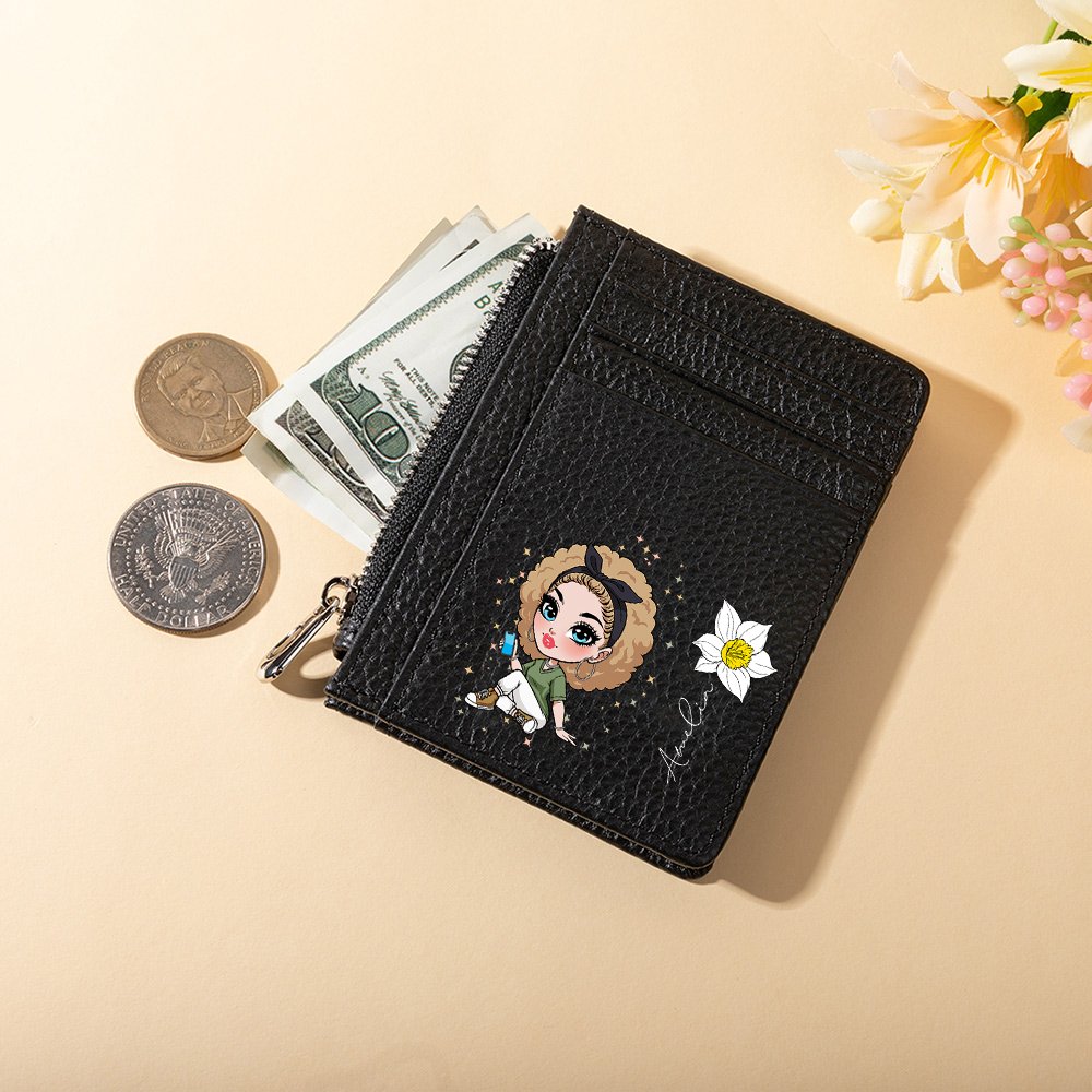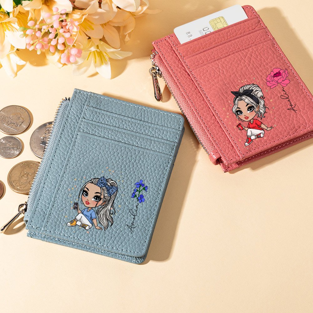 De portemonnee heeft een mooi ontwerp van verjaardagsbloemen en cartooneske meisjes, wat speels en stijlvol is. Bovendien kun je hem personaliseren met je eigen naam, zodat hij uniek is. De chique lederen afwerking verhoogt de elegantie, waardoor het een stijlvolle verfraaiing is voor op reis of dagelijks gebruik.