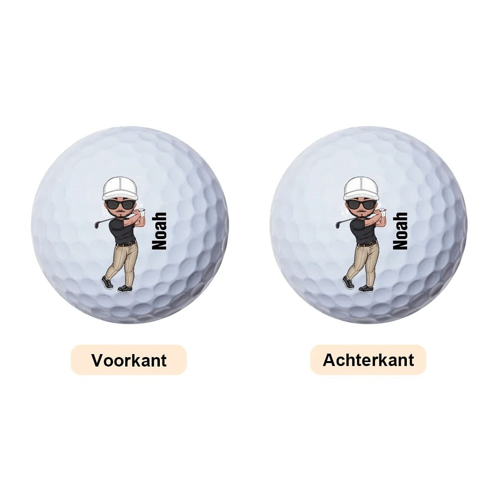 Deze golfballen hebben gepersonaliseerde stripfiguren die kunnen worden aangepast om op de golfer te lijken, of het nu een man of een vrouw is. Het karakter kan worden aangepast met specifieke kenmerken, kapsels en golfkleding, waardoor elke set echt uniek wordt. Deze personalisatie verandert standaard golfballen in leuke, karaktervolle items die de persoonlijkheid van de golfer weerspiegelen.