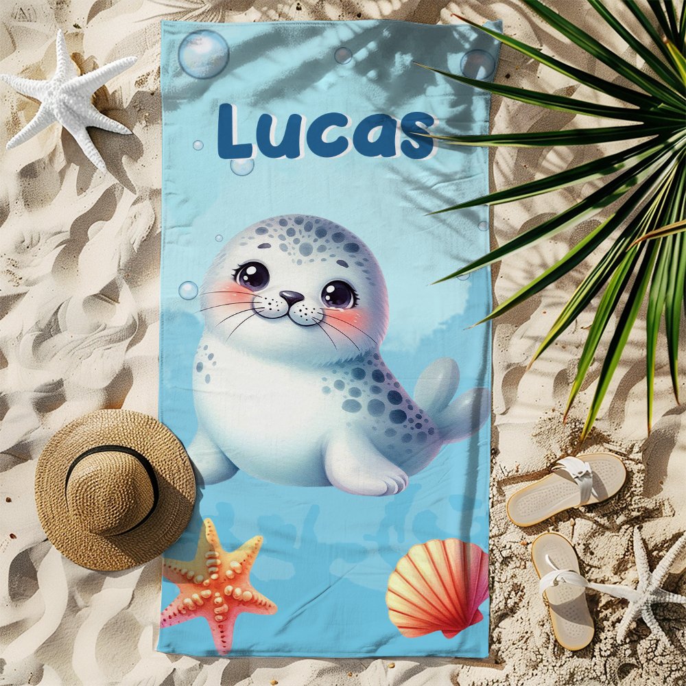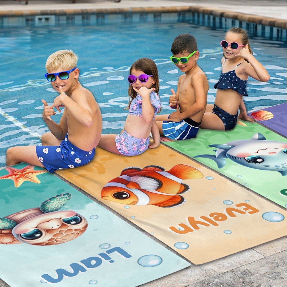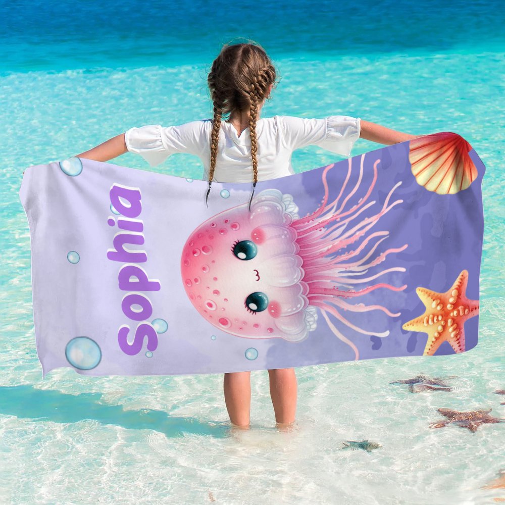 Dit strandlaken heeft 16 patronen van zeeleven, waaronder kwallen, walvissen, zeepaardjes, octopussen en meer. Met zeesterren en schelpen als achtergrond, vangt het de schoonheid van de oceaan en neemt het kinderen mee op een fantastisch onderwateravontuur. Je kunt het ook aanpassen met de naam van je kind en kiezen uit zes kleuren, waardoor het echt een uniek accessoire wordt.