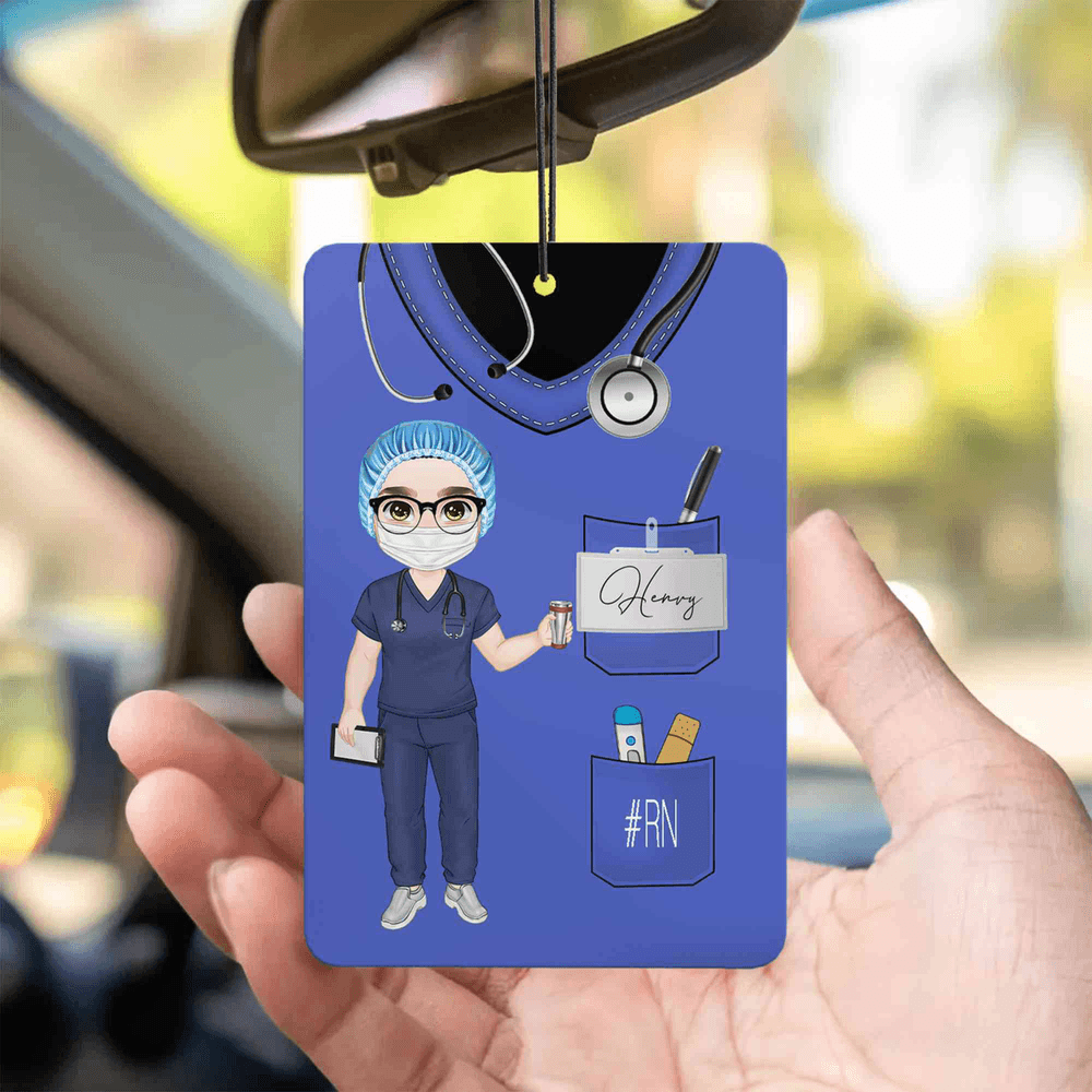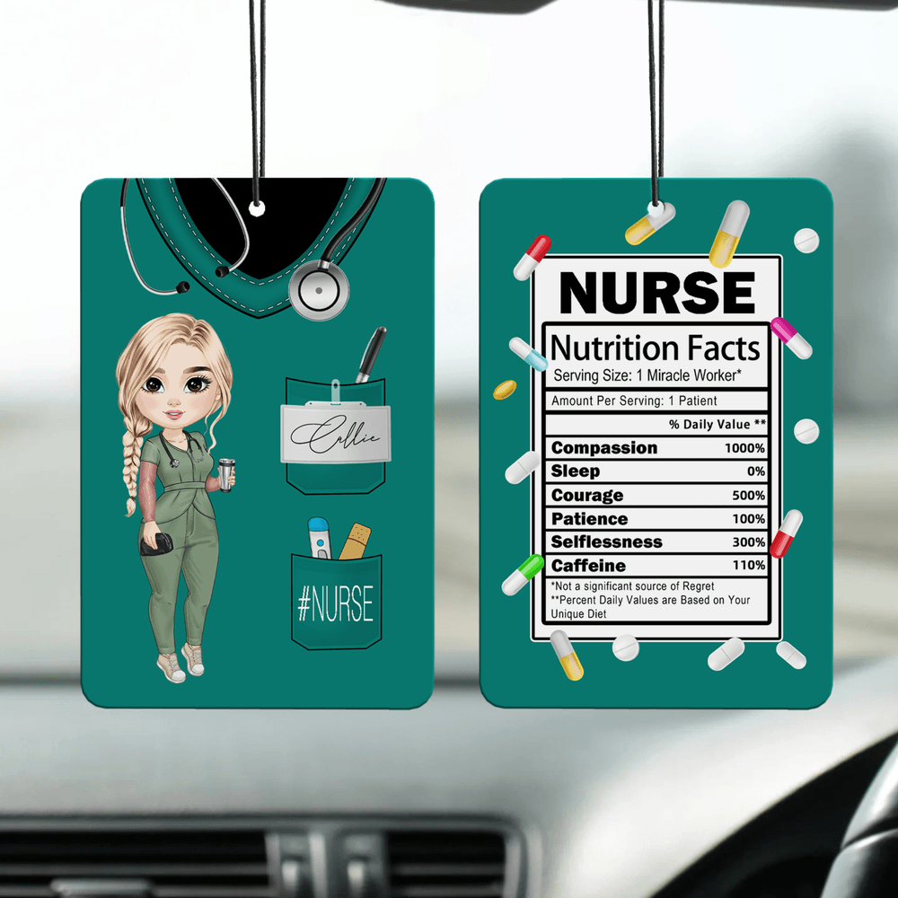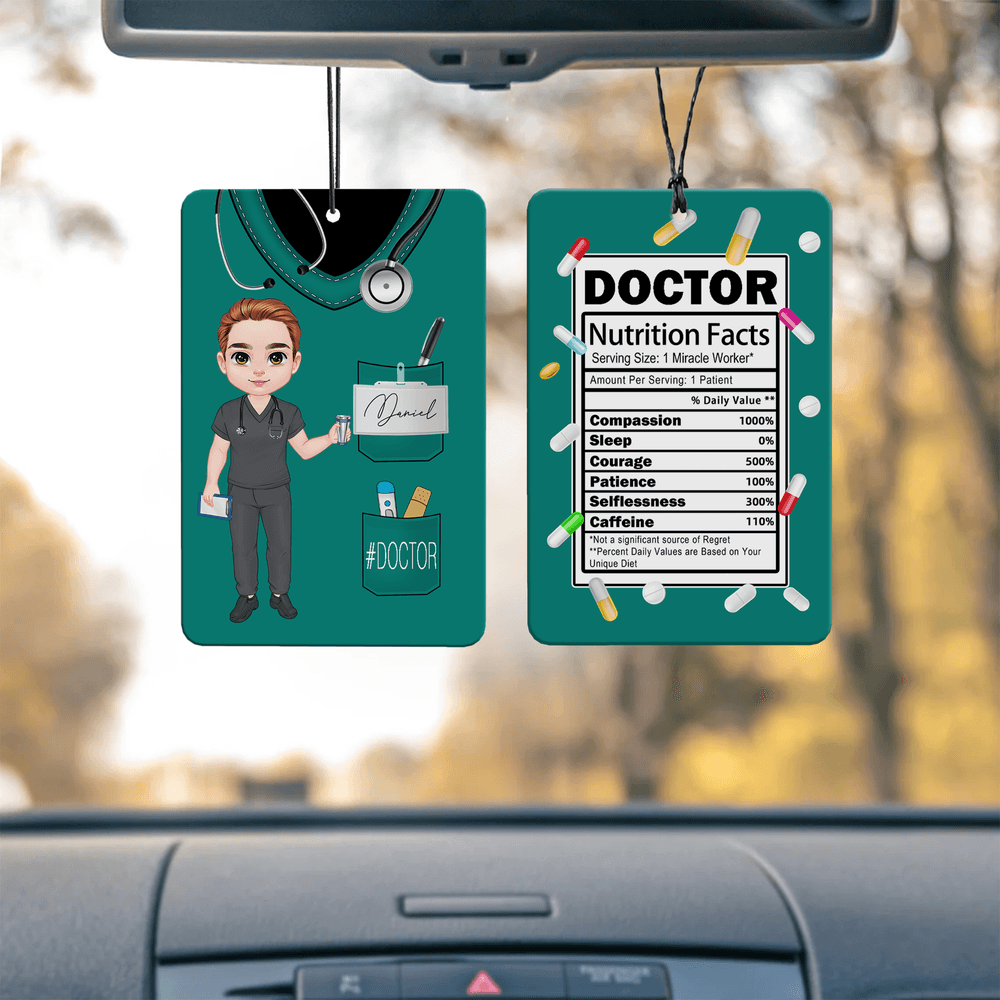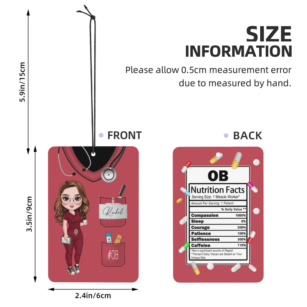 Leuke mannelijke en vrouwelijke dokter en verpleegster clipart in professionele medische uniformen. Personaliseer met naam en functie, plus een leuk "Nutrition Facts"-achtig ontwerp op de achterkant voor extra persoonlijkheid.