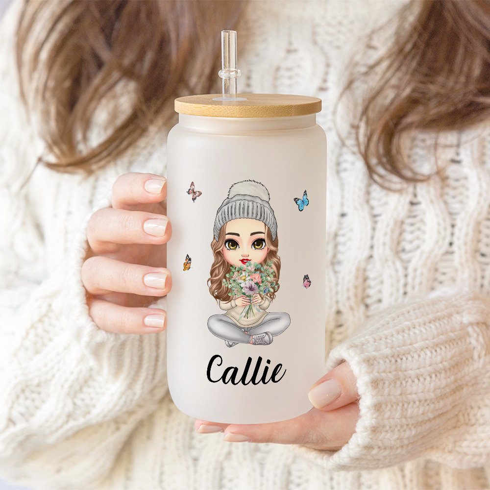 Het ontwerp toont een charmant stripfiguurtje van een moeder of oma die een prachtig boeket geboortebloemen vasthoudt. De bloemen zijn ingewikkeld gedetailleerd en hebben elk een speciale betekenis in verband met de geboortemaanden. Het karakter is afgebeeld met een warme en liefdevolle uitdrukking, wat een persoonlijk tintje toevoegt. Rondom het personage fladderen delicate vlinders, wat de algehele esthetiek versterkt. De optie om een persoonlijke naam toe te voegen maakt het een uniek item.