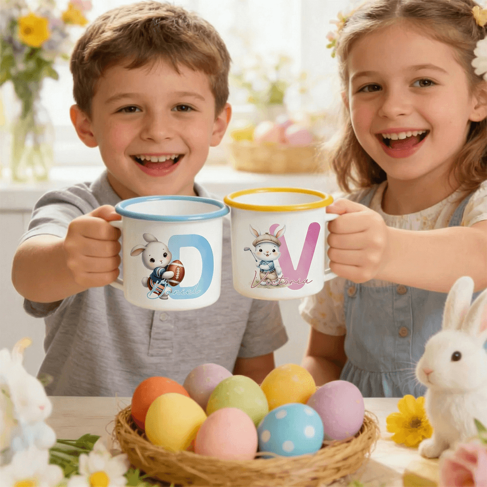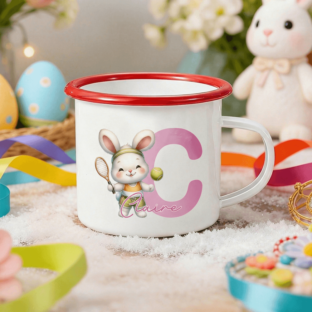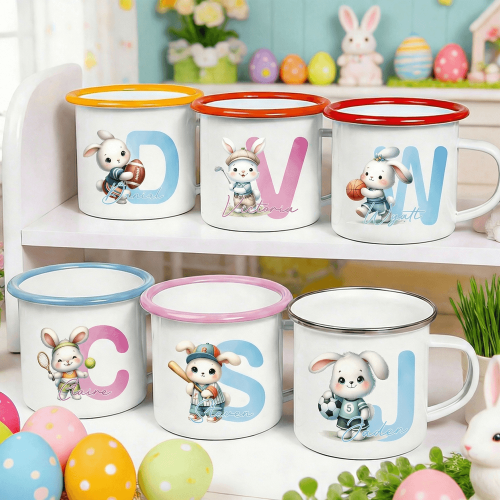 Met een schattig sportkonijntje als het belangrijkste visuele element, houdt elk konijntje verschillende sportartikelen vast, zoals basketballen, voetballen en tennisrackets, gecombineerd met felgekleurde randen en aanpasbare hoofdletters. Dit ontwerp combineert kinderlijke vitaliteit met persoonlijke identificatie en breekt met de eentonigheid van gewone emaille mokken. Het visueel rijke en opvallende ontwerp laat een unieke persoonlijkheid en jeugdige energie zien.