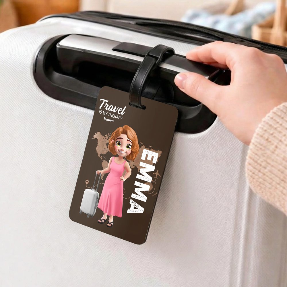 Op dit bagagelabel staat een schattig cartoonfiguurtje dat een koffer trekt, vol leuke reis- en vakantie-elementen. De achtergrond met landkaart, het vliegtuig en vrolijke teksten zoals “Travel is my therapy” en “So the adventure begins” zorgen voor een ontspannen en vrolijke sfeer. Je kunt het bagagelabel helemaal personaliseren met je naam, zodat elk exemplaar uniek is.