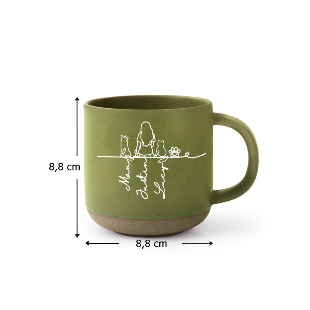 Deze gepersonaliseerde mok is voorzien van een unieke lijntekening die de natuurlijke uitstraling en rustieke charme van het keramiek benadrukt. Je kunt het ontwerp personaliseren met illustraties van je huisdieren en hun namen, en zelfs een tekening van jezelf met je naam toevoegen. De strakke lijnen leggen de warme band tussen baasje en huisdier prachtig vast en maken van de mok een blijvende herinnering. Verkrijgbaar in zes kleuren, passend bij elke smaak. Elke mok is uniek en weerspiegelt de speciale band die je deelt met je huisdier.