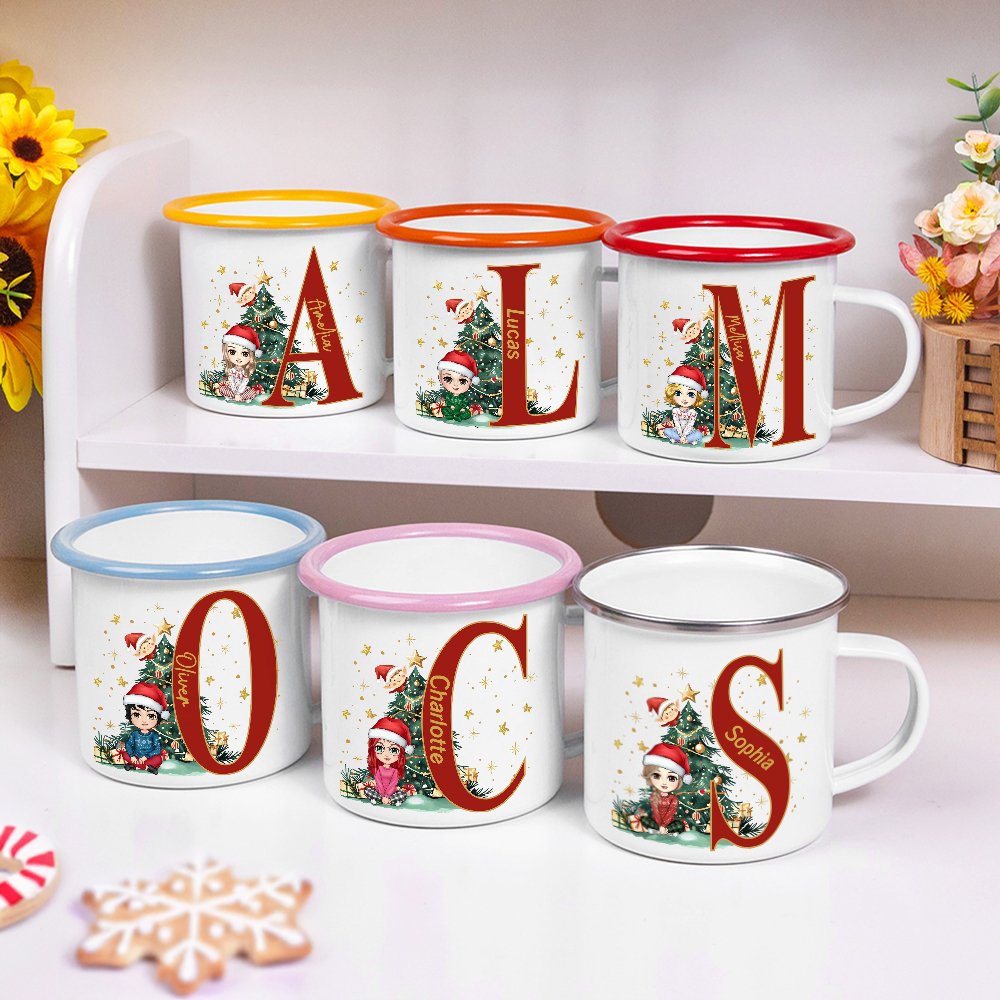 Deze 12 oz emaille mok heeft een schattig ontwerp van een kersttekenfilmfiguur en kan bedrukt worden met de initialen en naam van de ontvanger. Dit maatwerk voegt een persoonlijk tintje toe en maakt het een betekenisvol cadeau.