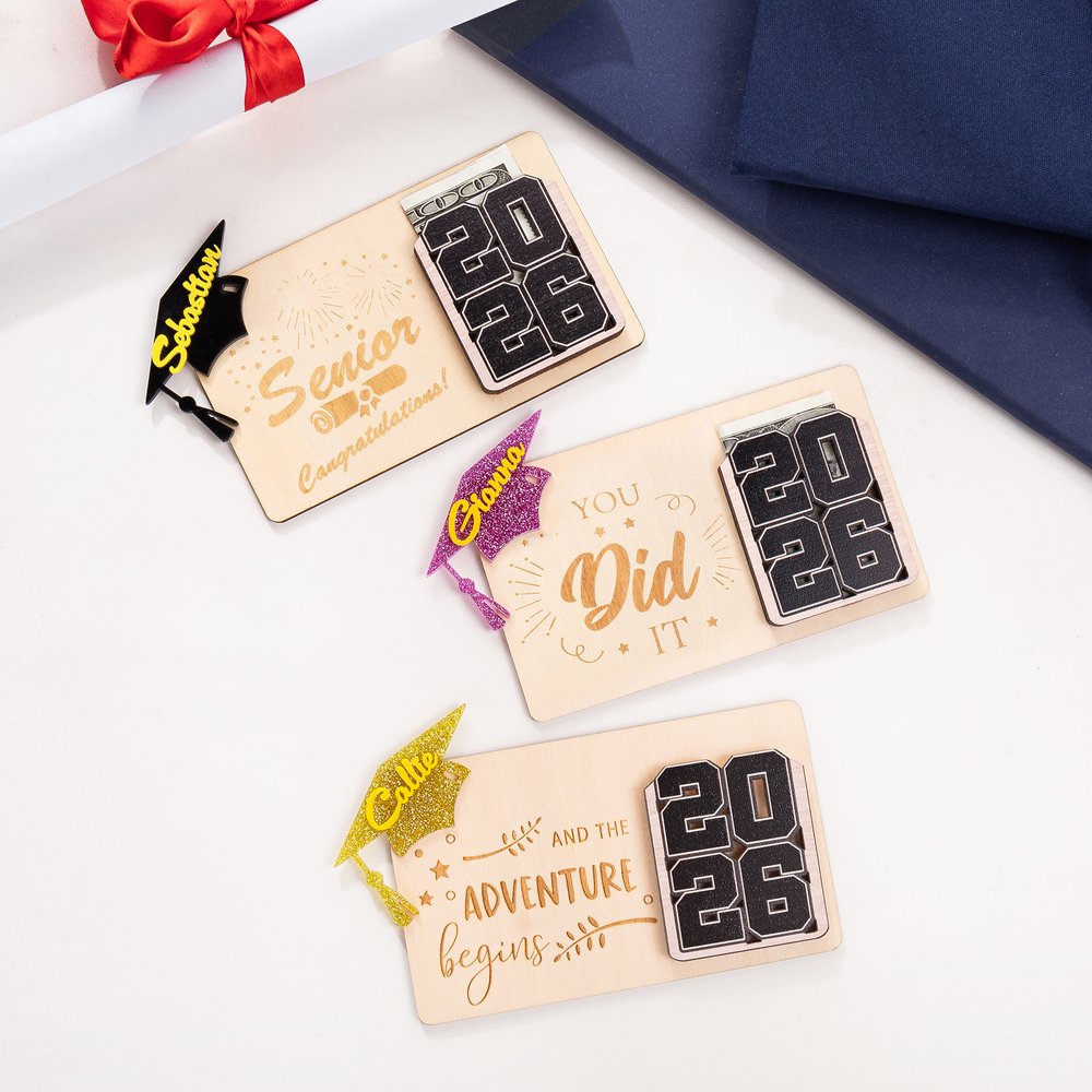 Deze geldhouder is gemaakt van hoogwaardig lindenhout; de natuurlijke nerf en warme tinten voegen een rustieke charme toe, terwijl de gladde, gepolijste afwerking hem een strakke, moderne uitstraling geeft. Het graveer- en snijproces zorgt voor een scherpe, duidelijke weergave van de naam en het jaar van de klas van de afgestudeerde, wat een langdurig en dierbaar aandenken belooft.