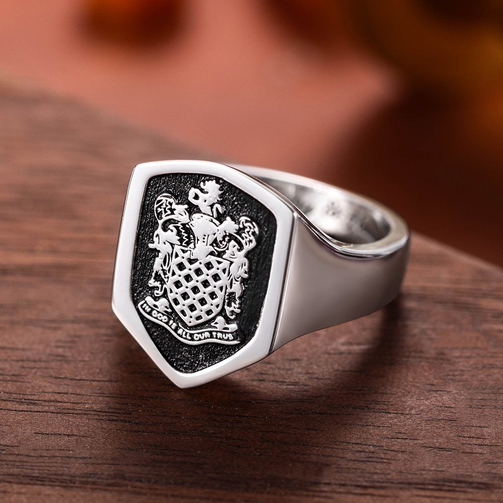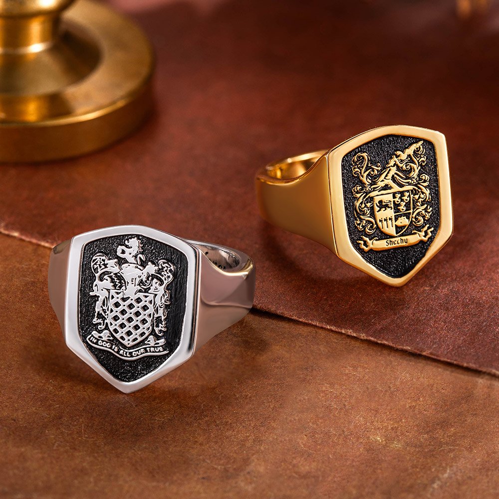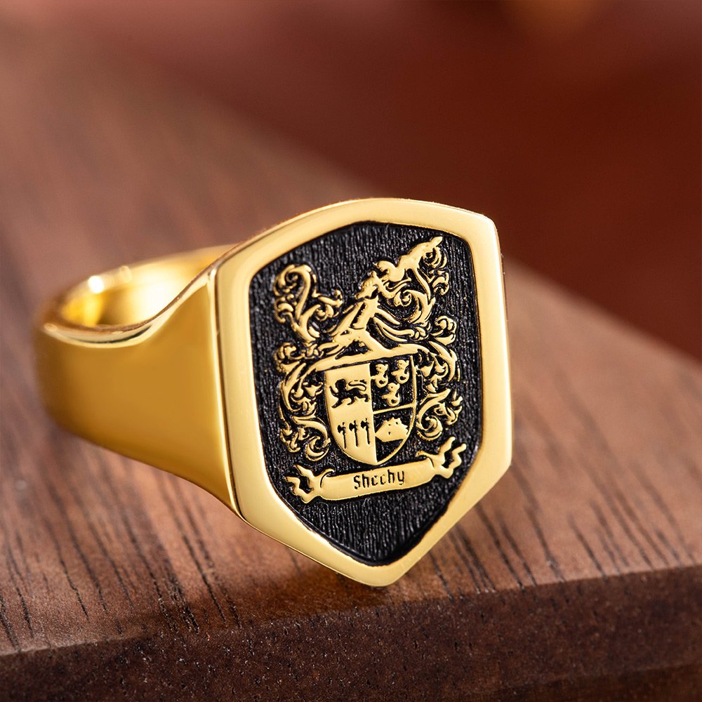 Deze gepersonaliseerde zegelring heeft een klassiek schildvormig ontwerp. Je kunt je familiewapen, dat het unieke van je familie laat zien, uploaden naar deze ring. De opvallende esthetiek is een eerbetoon aan het erfgoed van je familie.