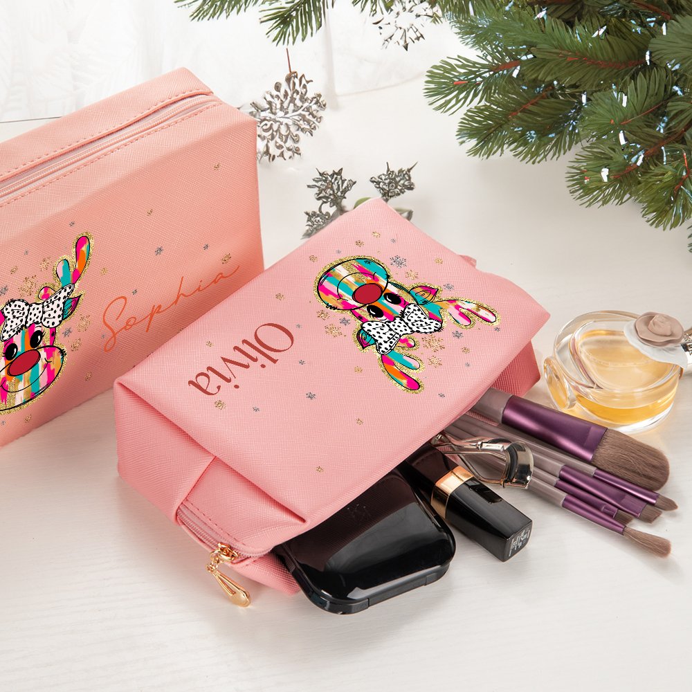 Ons make-uptasje heeft een glinsterend, kleurrijk kerstrendierontwerp met een delicaat strikje, dat speels en schattig is, perfect voor de kerstsfeer. Je kunt er een naam aan toevoegen om de stijl van de ontvanger weer te geven.