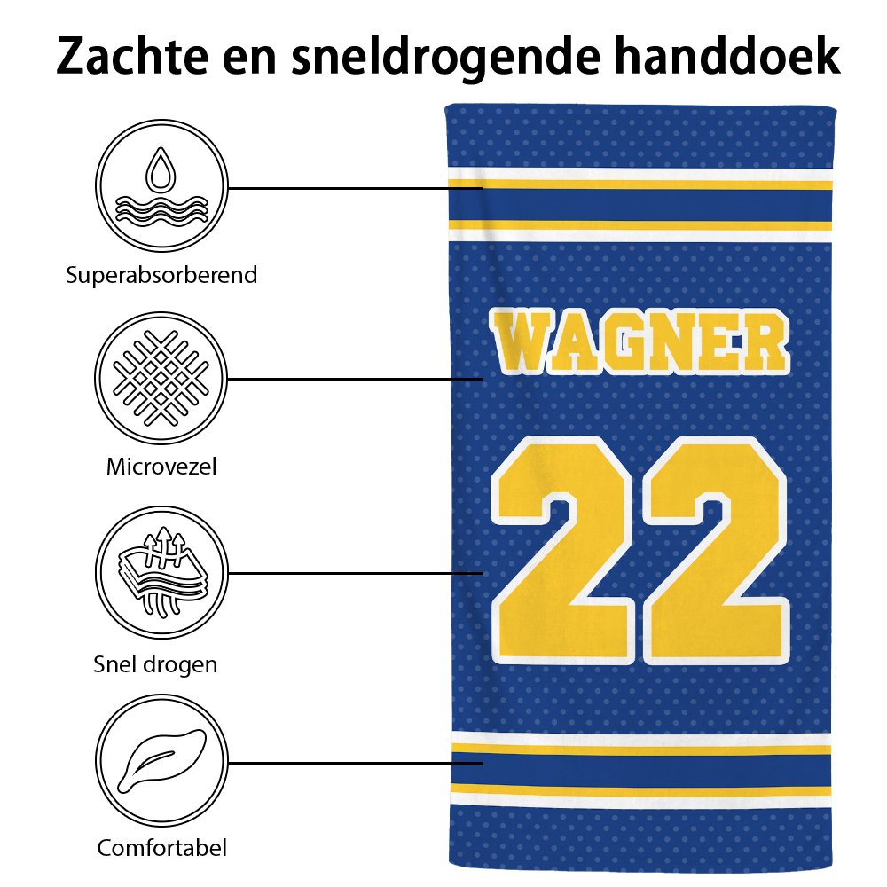 Dit strandlaken in sportstijl verwerkt op ingenieuze wijze de kleuren van het team als inspiratie in het ontwerp. Ons strandlakenontwerp richt zich ook op een opvallend nummer en kleurrijke strepen. Je kunt kiezen uit 12 kleuren en 2 maten en je kunt je naam aanpassen om je persoonlijkheid te laten zien.