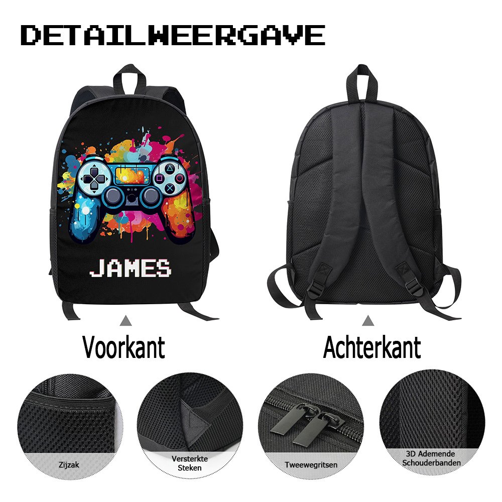 Deze stijlvolle rugzak is voorzien van een unieke gamepadafbeelding in spetterinkt, verkrijgbaar in negen levendige ontwerpen. De kleurrijke en creatieve esthetiek maakt het een trendy keuze voor kinderen en studenten die van gamen houden. Bovendien kun je je rugzak personaliseren met een naam, waarbij je kunt kiezen uit zes verschillende kleuren voor extra personalisatie.