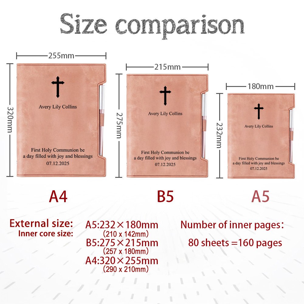 Dit leren notitieboek heeft een prachtig kruisontwerp met een vintage uitstraling en kan worden bedrukt met je naam, tekst en datum. Het is de perfecte plek om gebeden, overdenkingen en herinneringen van de eerste communie en daarna in op te schrijven, zodat je gebedsdagboek een persoonlijke uitdrukking van je geloof wordt.