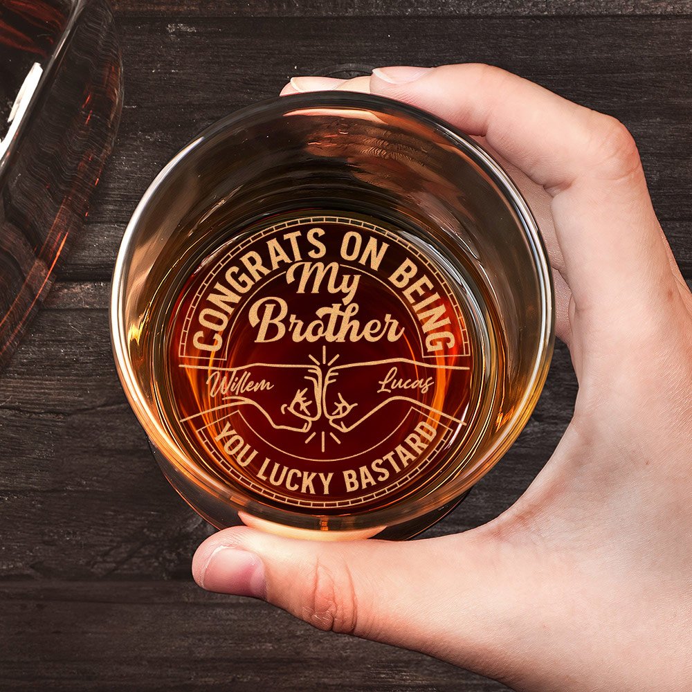 Dit whiskyglas is bedrukt met de woorden "CONGRATS ON BEING". Je kunt de naam en titel onderaan naar wens aanpassen. De tekst "YOU LUCKY BASTARD" onderaan brengt een soort intimiteit en humor over. Het vuistslagpatroon voegt een gevoel van stilzwijgend begrip en vriendschap toe.