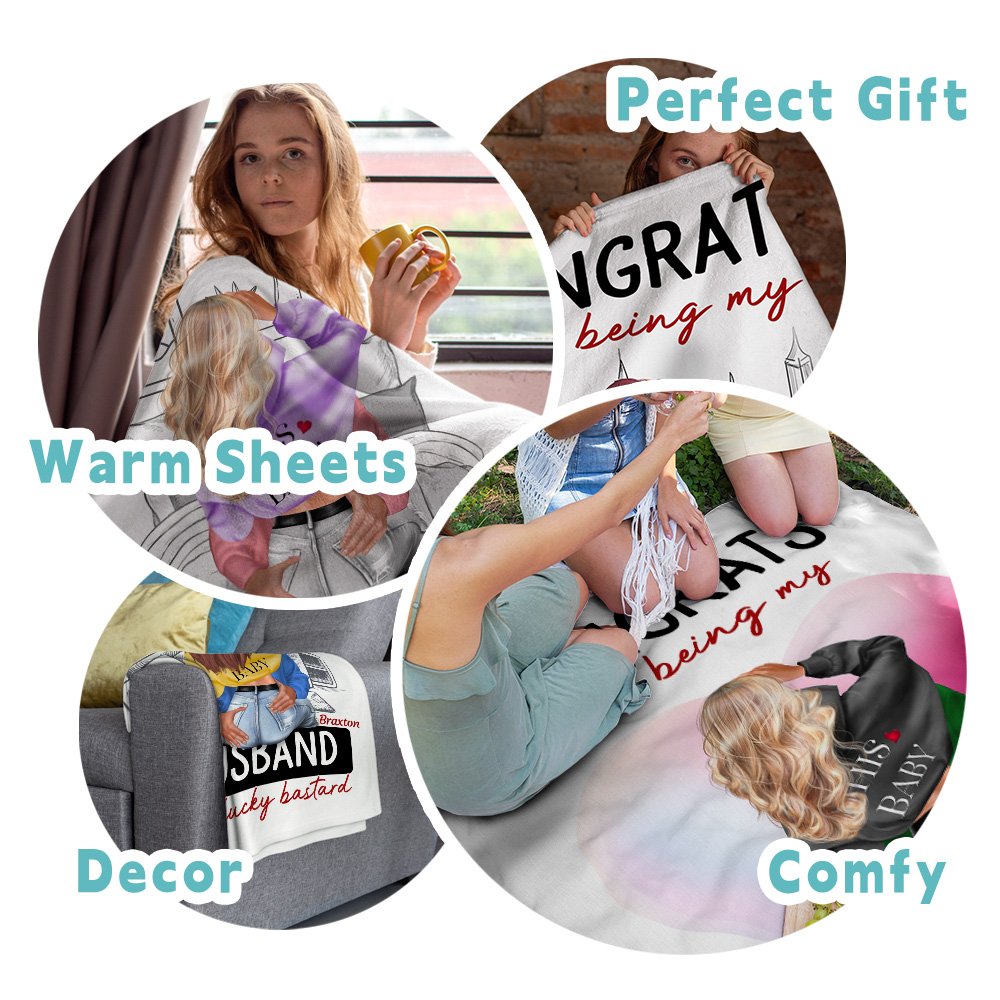 Onze deken heeft een omhelzend paar als ontwerpelement, met een gezellige slaapkamer als achtergrond en de tekst "Congrats On Being My Husband You Lucky Bastard" om het algehele ontwerp meer emotionele boventonen te geven. De deken zelf symboliseert warmte, terwijl het ontwerp van de minnaar het een meer gepassioneerde en romantische betekenis geeft, waardoor deze deken een echte noodzaak is voor koppels.