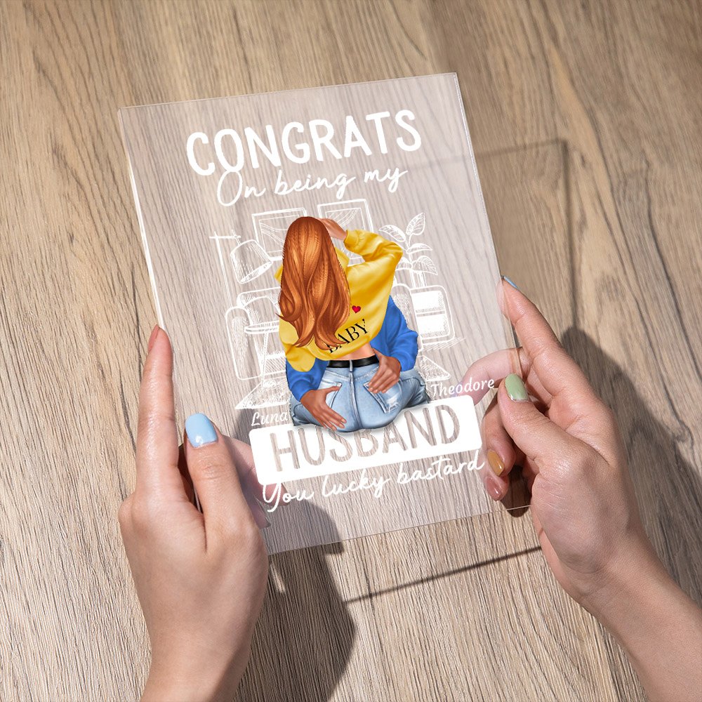 Dit is een acrylornament met een paarsthema; je kunt het aanpassen volgens de afbeelding van jezelf en je partner om je liefde aan hen uit te drukken. De boodschap "Congrats On Being My Husband You Lucky Bastard" is op het acrylornament gedrukt om het liefdesverhaal tussen jou en je geliefde te koesteren.