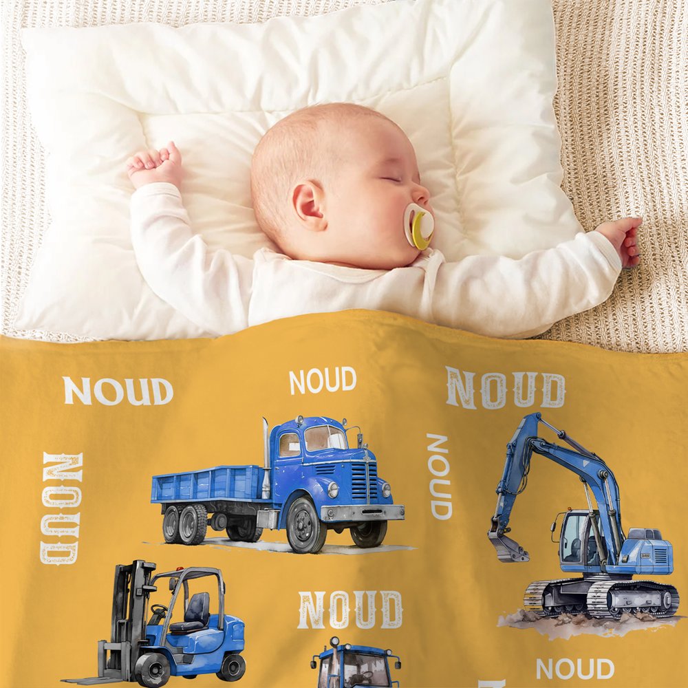 Deze gepersonaliseerde deken heeft een uniek ontwerp met verschillende technische voertuigen en de naam van uw kind. Het is een bijzonder aandenken dat elk knuffelmoment onvergetelijk maakt en de unieke persoonlijkheid van uw kind en zijn of haar passie voor techniek benadrukt.