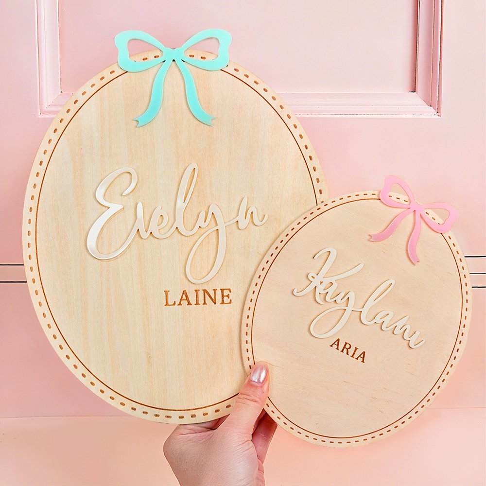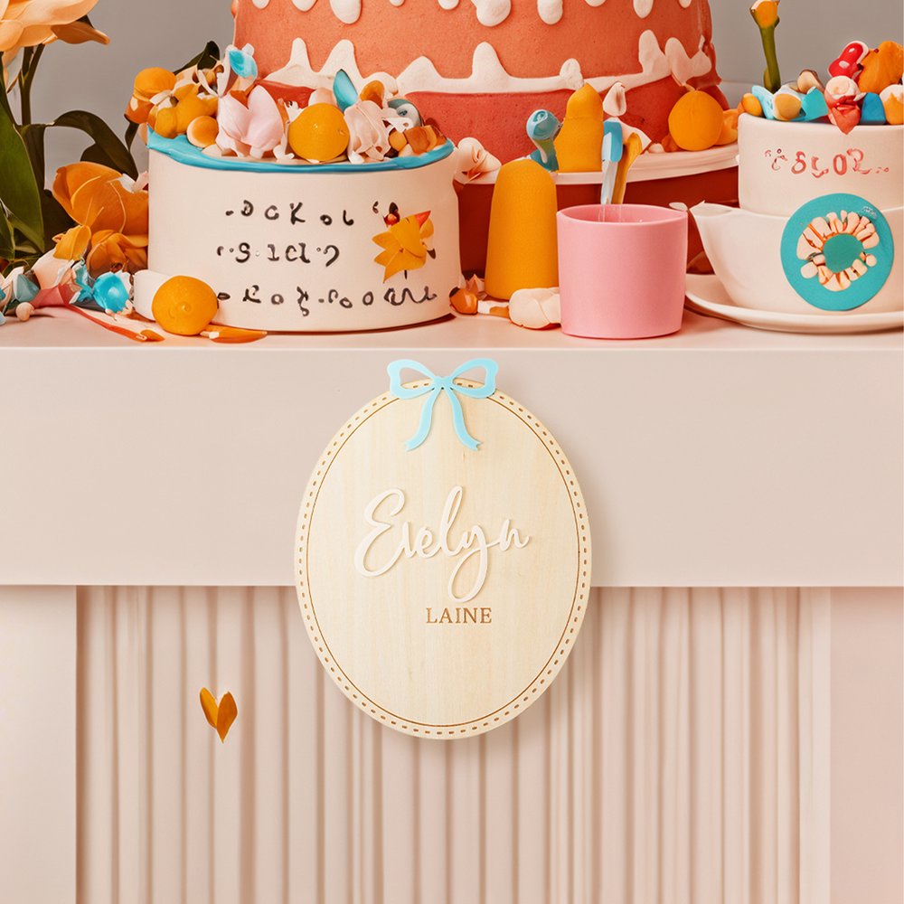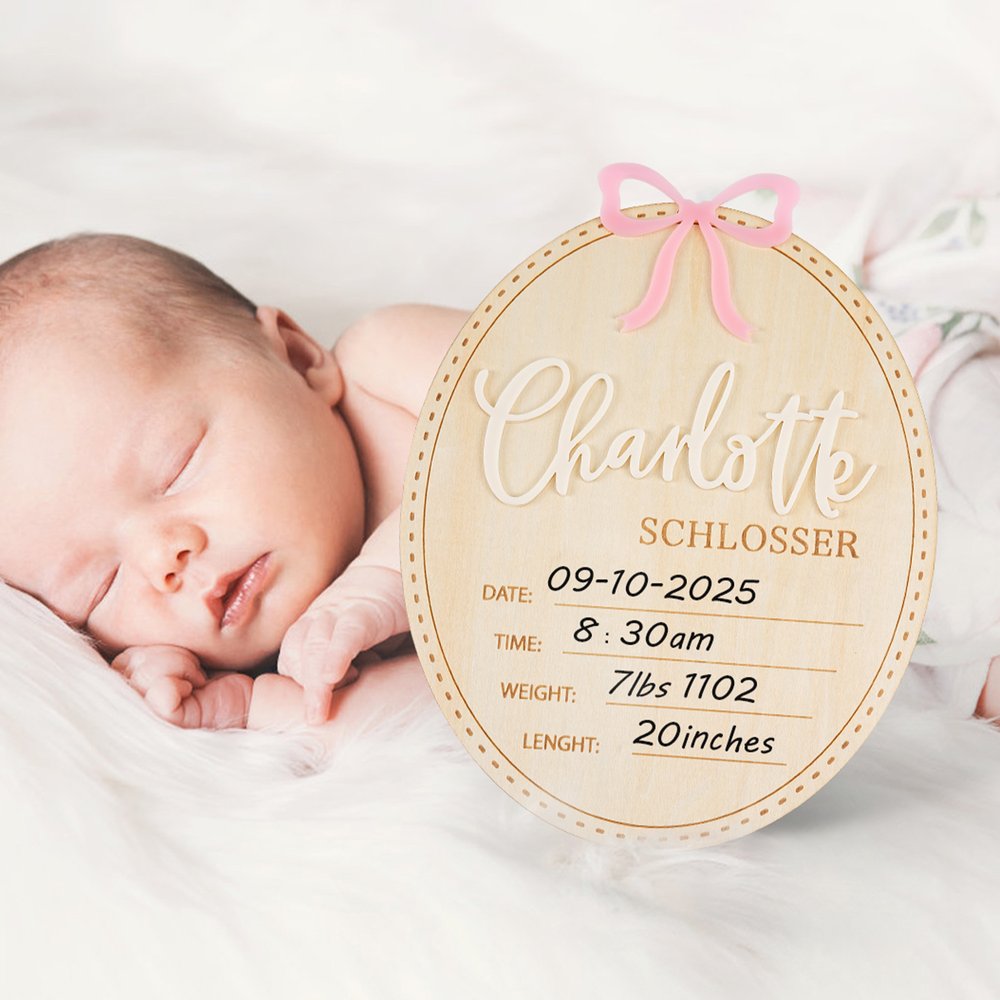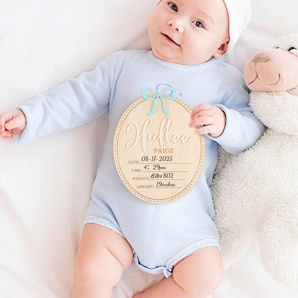Ons ovale aankondigingsbord is voorzien van een eenvoudige strik en elegante cursieve kalligrafie om de komst van je baby te vieren. Een speciaal ontworpen gebied voor geboortekaartjes voegt een vleugje personalisatie toe, waardoor ouders hun vreugde kunnen delen met vrienden en familie op een unieke manier, die de liefde en verwachting van een pasgeborene vastlegt.