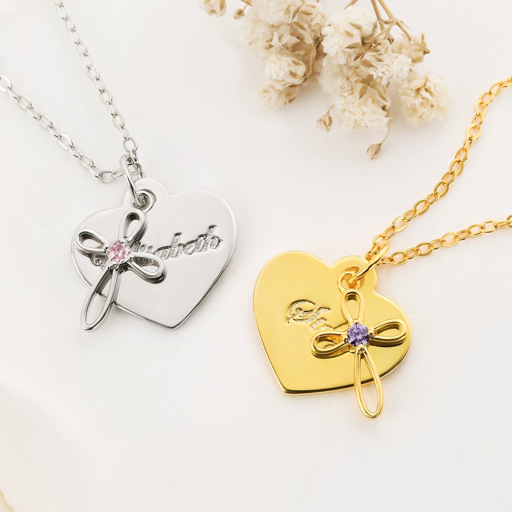 Het combineert religieuze symboliek (kruis) met hartgravures. Je kunt een geboortesteen kiezen voor het midden van het kruis, zodat het bij een geboortemaand past. Bovendien kun je de tekst op de hartvormige hanger graveren. Het minimalistische maar betekenisvolle ontwerp creëert een lieve, verfijnde stijl die perfect is voor iedereen die zijn geloof en identiteit met gratie wil dragen.