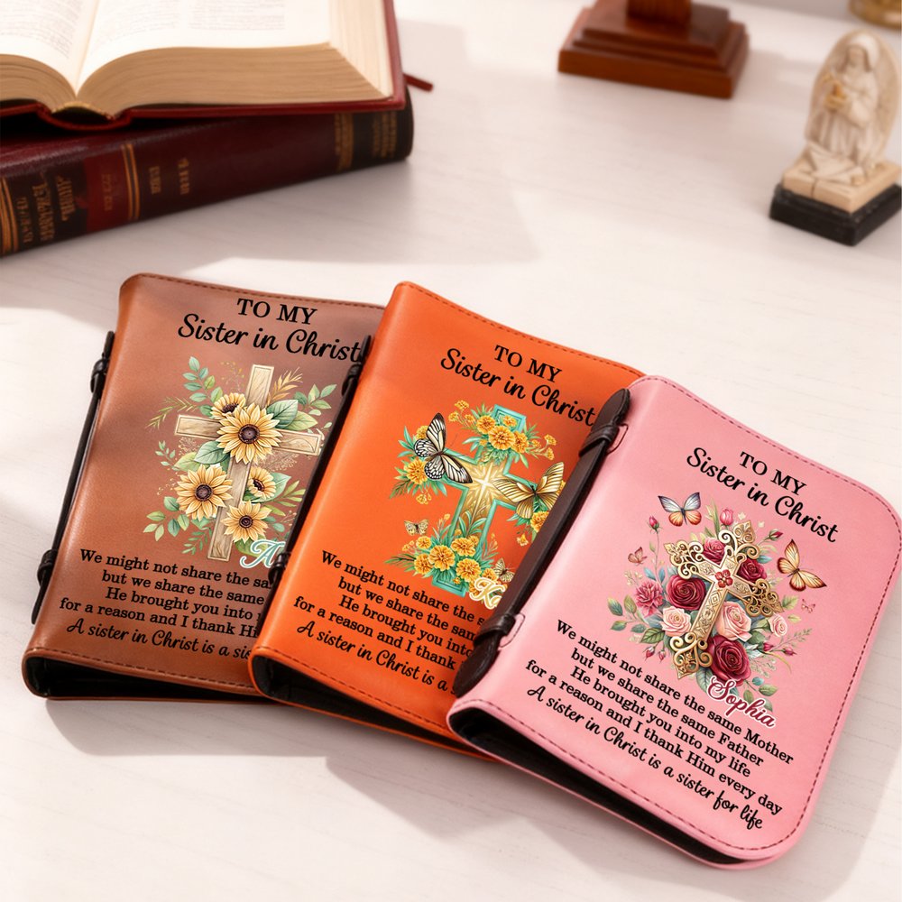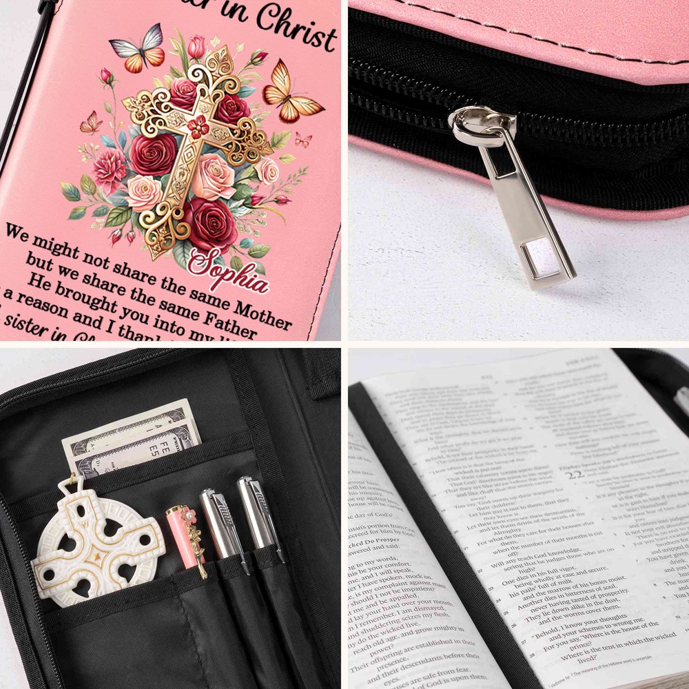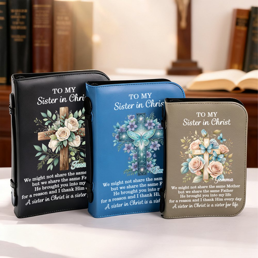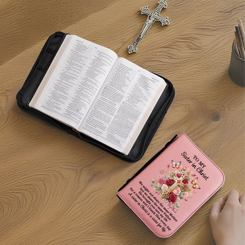 Deze bijbelhoes heeft een eigen ontwerp: een kruis in combinatie met bloemmotieven bij de geboorte, plus jouw naam. De boodschap "Aan mijn zus in Christus", gecombineerd met bloemen-/kruisaccenten, verandert een functionele omslag in een uniek, op het geloof gebaseerd aandenken dat religieuze eerbied combineert met persoonlijke identiteit.
