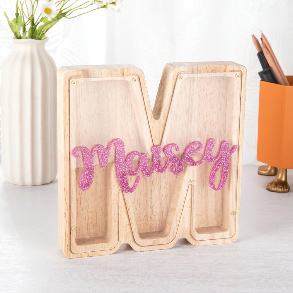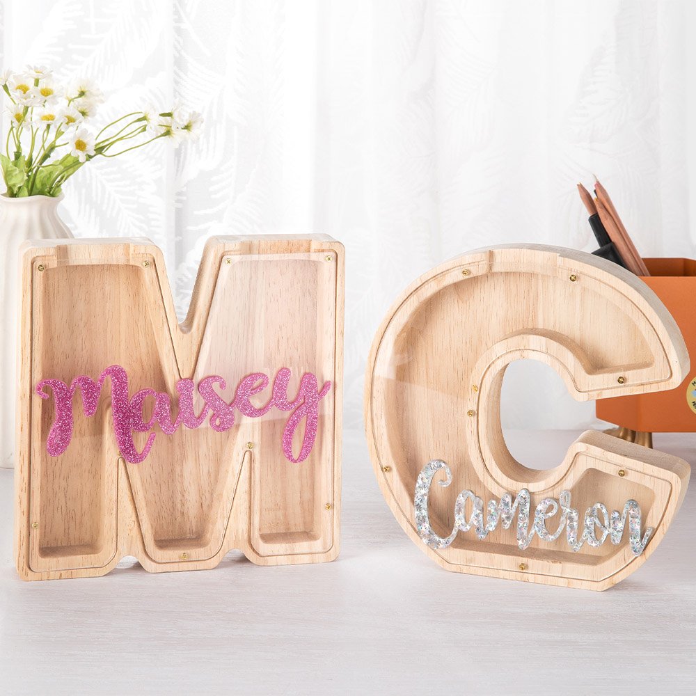 Gepersonaliseerde Houten Brief Spaarvarken Grote Geld Spaarvarken met Transparant Venster en Naam Kamer Decoratie Kerst Verjaardag Educatief Cadeau voor Kind
