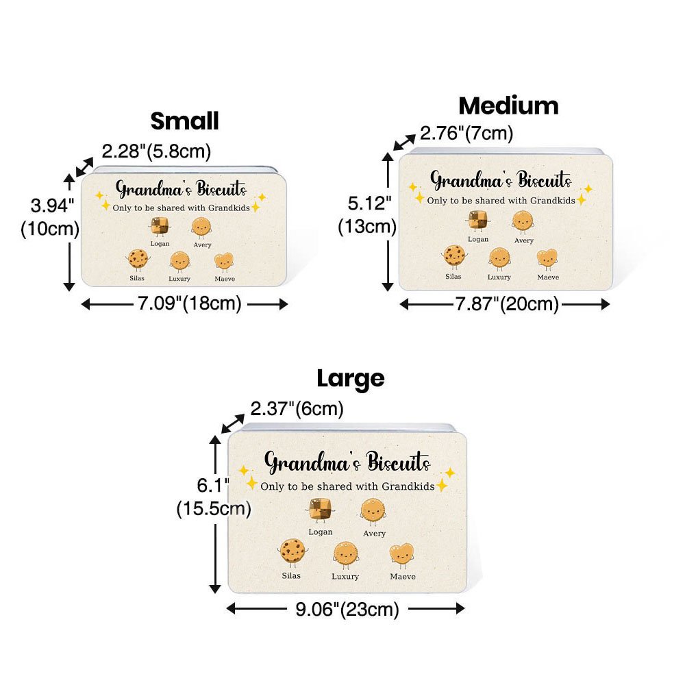 Onze koekjestrommels zijn bedrukt met verschillende cartoonachtige koekjespatronen, die stuk voor stuk levensecht en om van te watertanden zijn. Je kunt ervoor kiezen om 1-12 koekjes te personaliseren en de naam van het kind wordt onder elk koekje gedrukt. Dit ontwerp voegt niet alleen plezier en exclusiviteit toe, maar maakt van deze koekjestrommel ook een liefdevol souvenir.