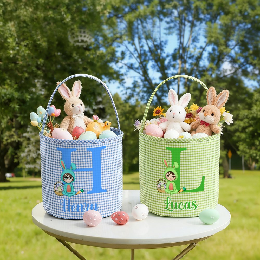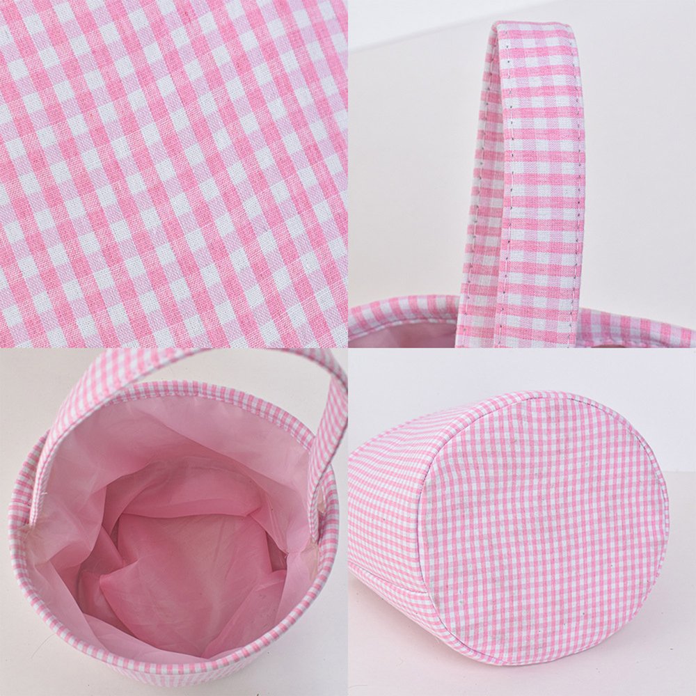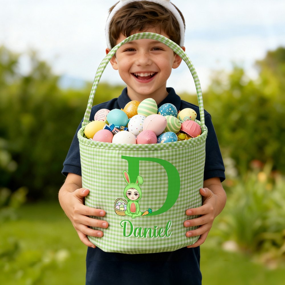 Met het schattige paashaasfiguurtje als kernelement van het ontwerp, kan dit mandje worden aangepast met de naam en initialen van het kind. Het heldere en verfrissende ruitjespatroon is verkrijgbaar in vier kleuren: paars, roze, blauw en groen. De mand is verkrijgbaar in zowel een geruite als een gladde versie en straalt een speelse, feestelijke sfeer uit.