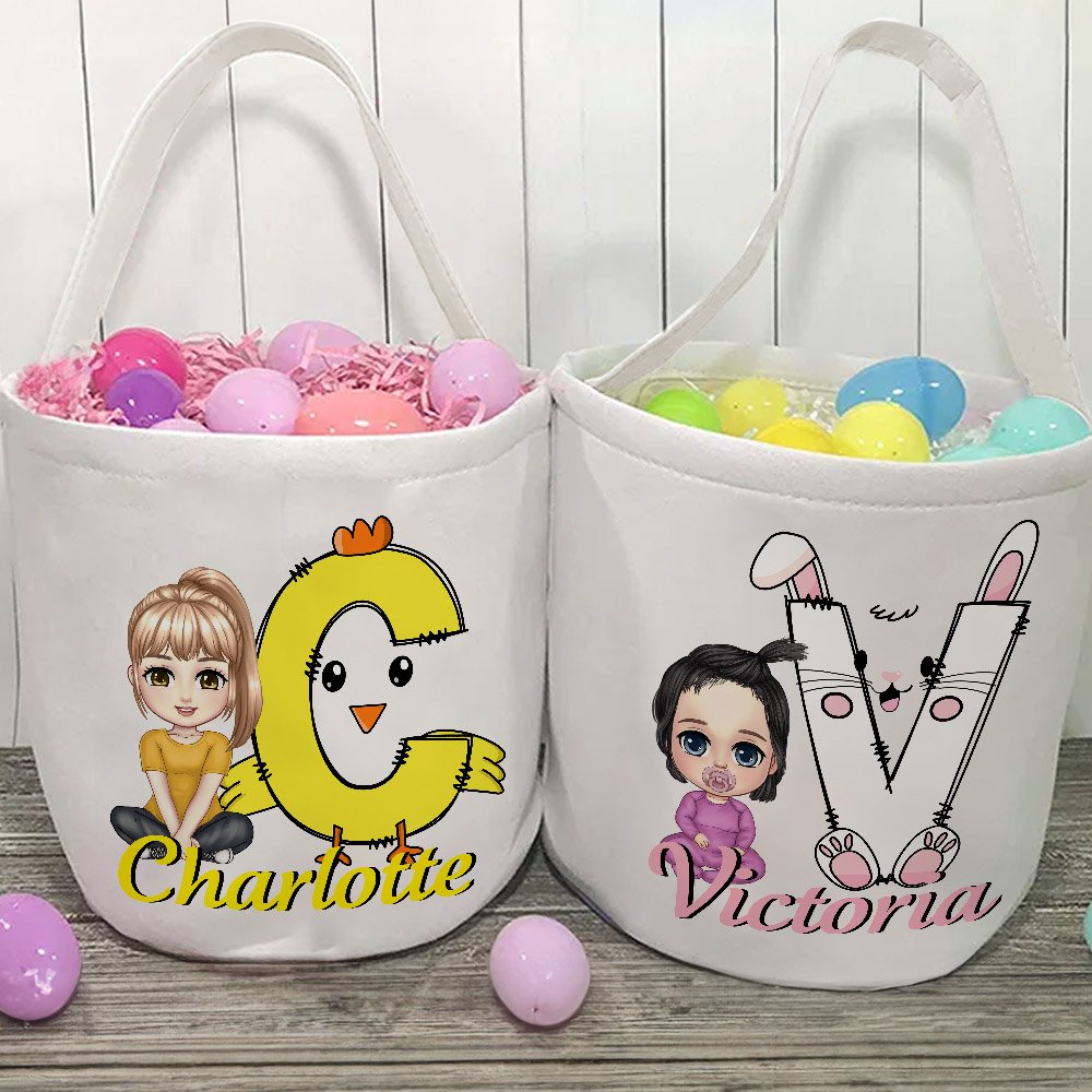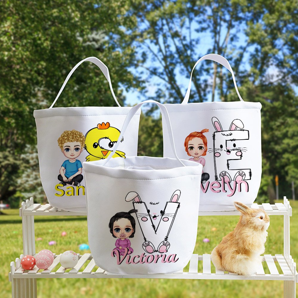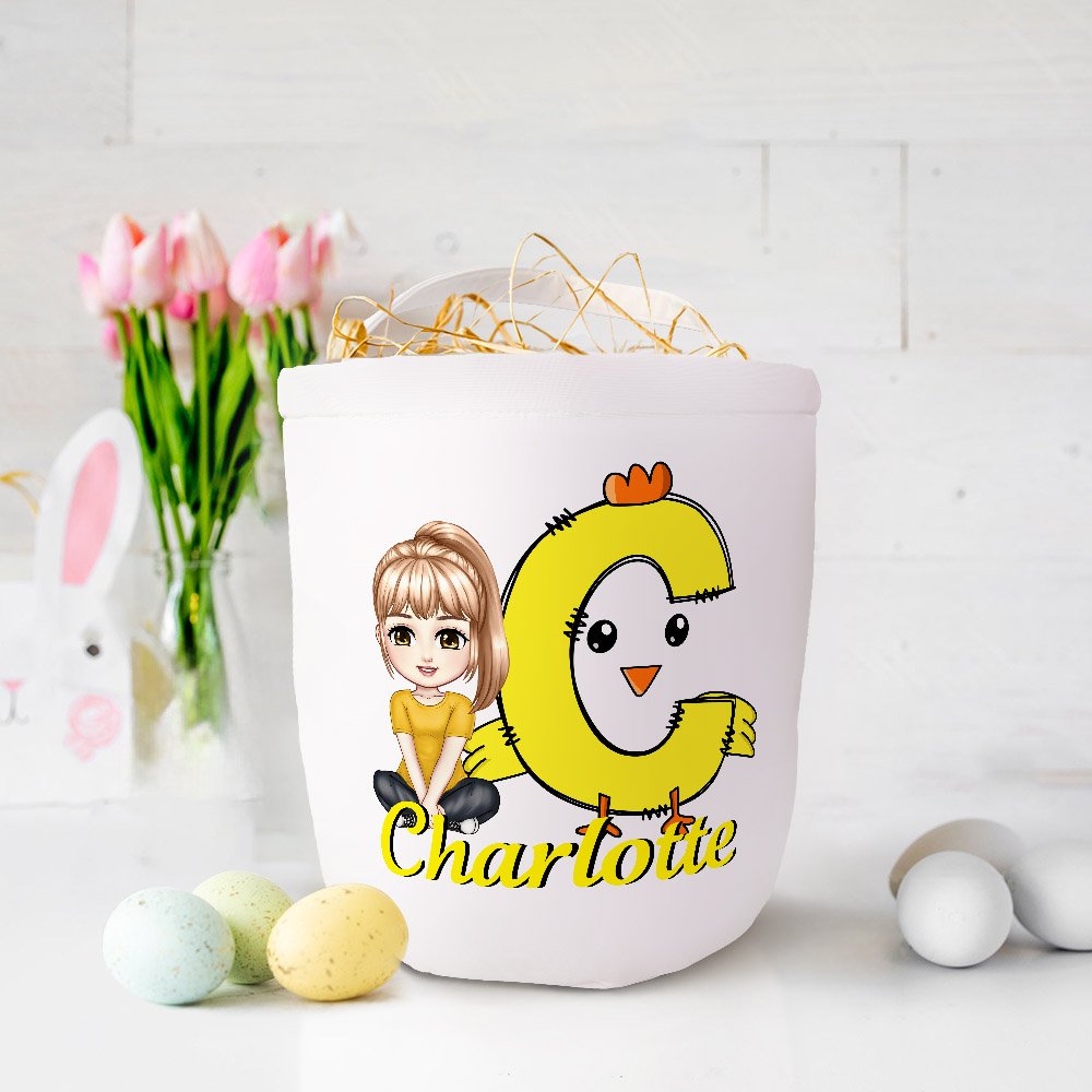 Het ontwerp van deze tas zit vol met leuke en persoonlijke elementen voor kinderen. Elke tas is bedrukt met een schattig stripfiguurtje en een letterpatroon. Stripfiguren zijn levendig en kleurrijk, wat de aandacht van kinderen kan trekken en hun verbeelding kan stimuleren. Het ontwerp van het letterpatroon combineert ook elementen van konijntjes en kippen, wat een sterke feestelijke sfeer toevoegt aan de hele tas. Je kunt ook de naam van het kind op de tas aanpassen om hem specifieker te maken.