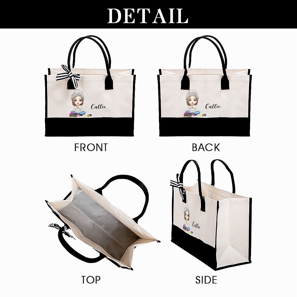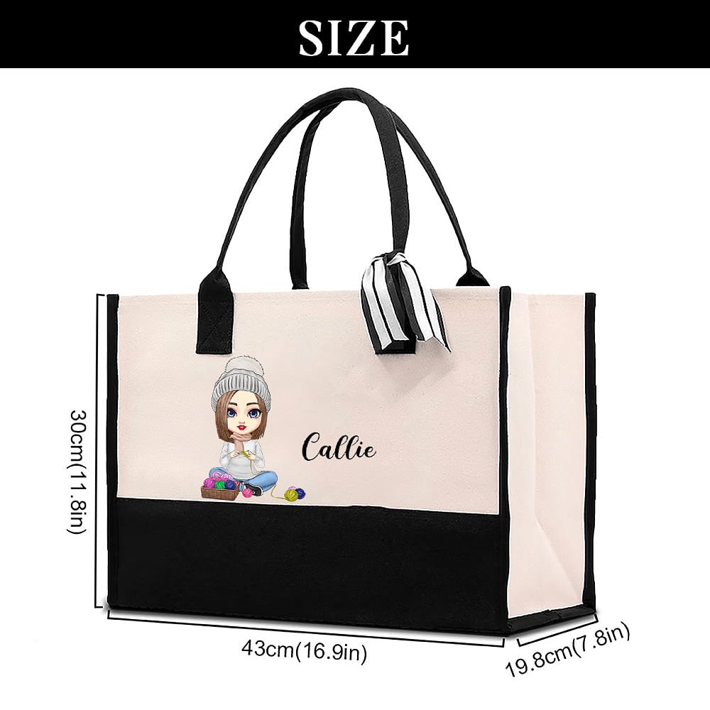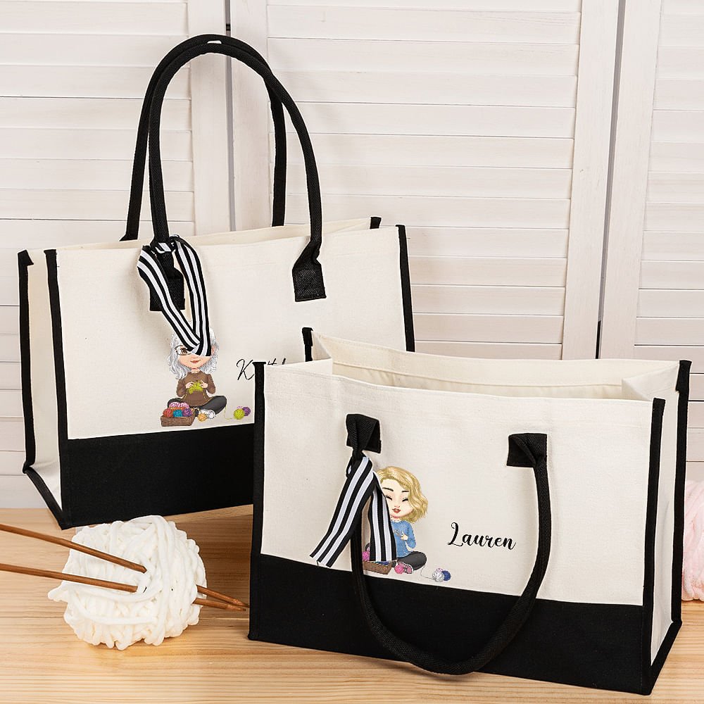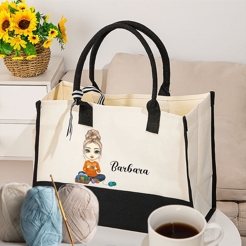 Deze tas is ontworpen voor haakliefhebbers. Personaliseer de tas met een stripfiguur dat de stijl van de ontvanger weerspiegelt en voeg de naam van de ontvanger toe om een uniek cadeau te maken dat ze zullen koesteren.