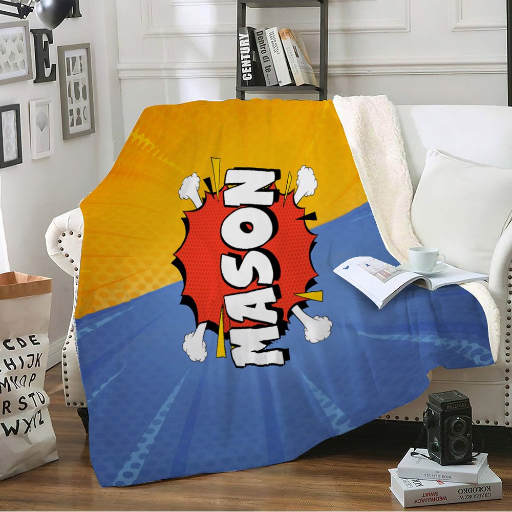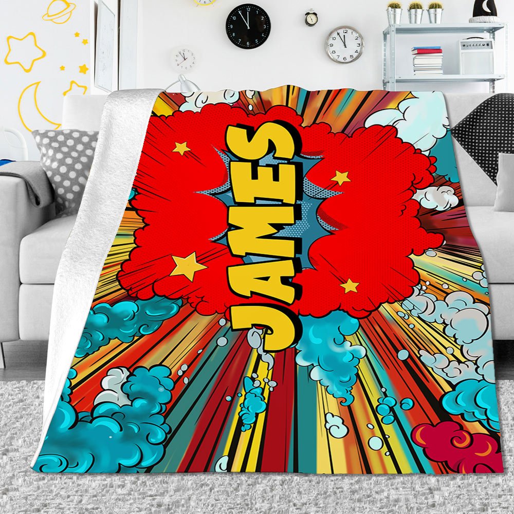 Deze deken heeft een visueel impactvol ontwerp in comic bubble stijl, geïnspireerd door klassieke Amerikaanse comic elementen, met felle kleuren en levendige patronen. Je kunt de naam van het midden aanpassen, met 5 soorten explosieve bubbelframes om uit te kiezen, met sterk contrasterende kleuren en gedurfde komische lettertypes, die erg persoonlijk en interessant zijn.
