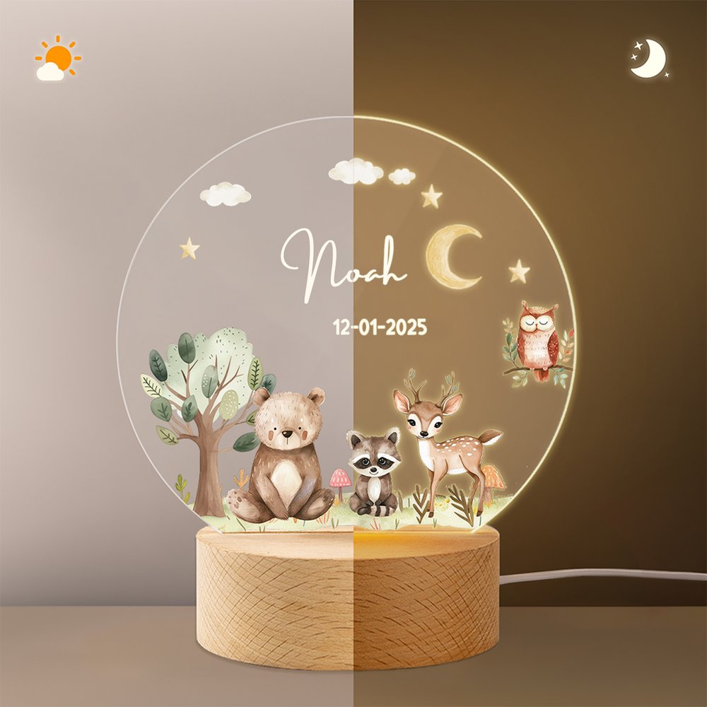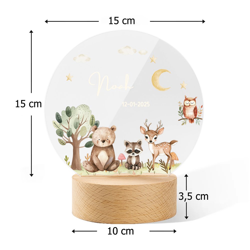 Dit nachtlampje is versierd met schattige dieren zoals een beer, hert, wasbeer en uil. Omringd door bomen, wolken en de maan ontstaat er een sfeervol boslandschap. U kunt een naam of persoonlijke tekst laten toevoegen, waardoor het een uniek en persoonlijk aandenken wordt.