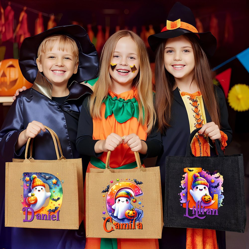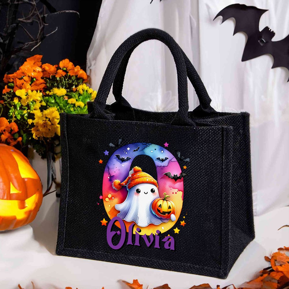 Deze draagtas heeft als thema Halloween en kan gepersonaliseerd worden. Je kunt letters van A-Z selecteren en een naam invullen. De tas heeft leuke Halloween letter-spookpatronen, met speelse spookafbeeldingen en elementen zoals pompoenen en sterren eromheen, waardoor de op maat gemaakte tas vol unieke vakantiepret zit.