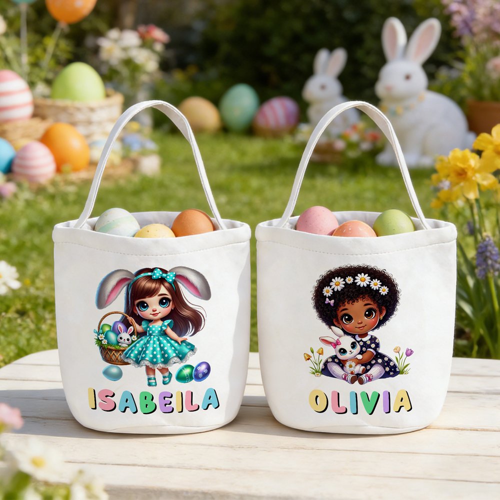 Je kunt een uniek paasmandje maken door de naam van je kind toe te voegen. Kies uit schattige illustraties van meisjes met konijnenoren, gecombineerd met paaselementen zoals konijntjes, eieren en bloemen. Dit persoonlijke tintje maakt van een basismandje een speciaal aandenken dat uniek aanvoelt, waardoor elke paaseierenjacht spannender en gedenkwaardiger wordt.