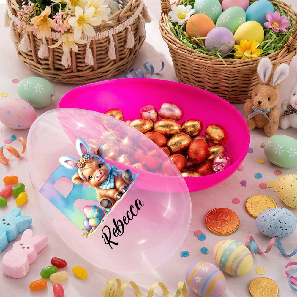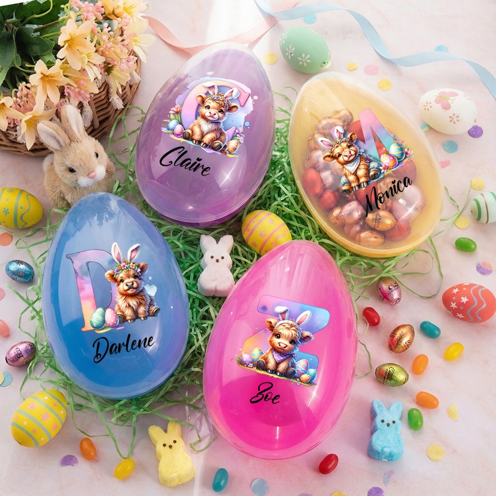 Dit ontwerp is gecentreerd rond de Hooglandse koe, die veerkracht en geluk symboliseert, en bevat aanpasbare initialen en namen, samen met schattige paaselementen. Verkrijgbaar in roze, geel, blauw en paars, met een levendige en feestelijke stijl, boordevol vakantieplezier.