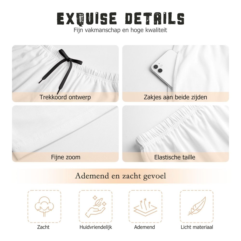 Gemaakt van zachte, ademende en huidvriendelijke eersteklas stof. Het lichtgewicht materiaal blijft koel tijdens het dragen 's nachts, waardoor u comfortabel kunt slapen. De elastische tailleband zit comfortabel zonder te knellen en is makkelijk aan- en uit te trekken. Voor dagelijks thuisgebruik bieden de twee zijzakken ruimte voor kleine spullen, zoals telefoons of afstandsbedieningen. Zo ontstaat een perfecte balans tussen comfort en functionaliteit.