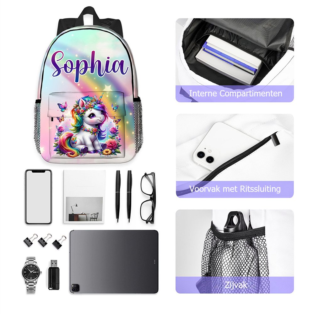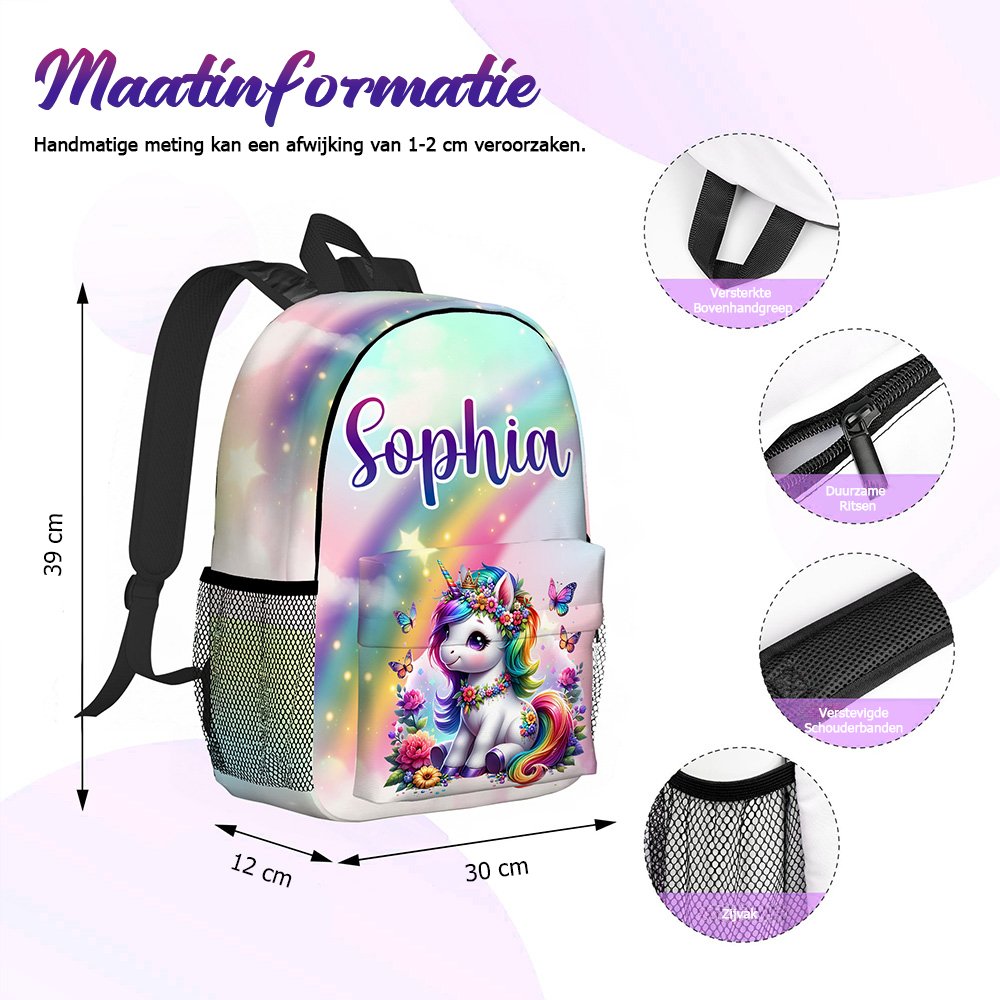 Onze schoolrugzak voor kinderen heeft vijf dromerige regenboogachtergronden en vijftien fantasie-eenhoornpatronen, speciaal ontworpen om kinderen te laten genieten van personalisatie en een fantasiewereld. Door een kindernaam toe te voegen, wordt het een unieke tas waar kinderen dol op zullen zijn en die ze zullen koesteren.
