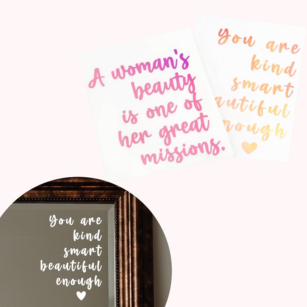 Deze unieke dagelijkse affirmatiestickers brengen levendigheid en positiviteit in elke ruimte. Levendige kleuren in combinatie met creatieve lettertypes verfraaien direct elke kamer of spiegel en voegen kleine vleugjes geluk toe.