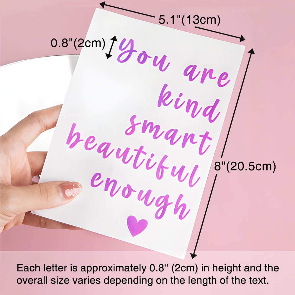 Gebruik deze stickers om je dierbaren te garanderen dat ze gekoesterd worden. Met hun felle kleuren en grillige lettertypes fleuren deze prachtige stickers elke kamer of spiegel direct op. Verras iemand met attente woorden die inspireren om sterk te blijven. Voeg deze aangepaste stickers toe en verspreid geluk op elke muur, spiegel of oppervlak!