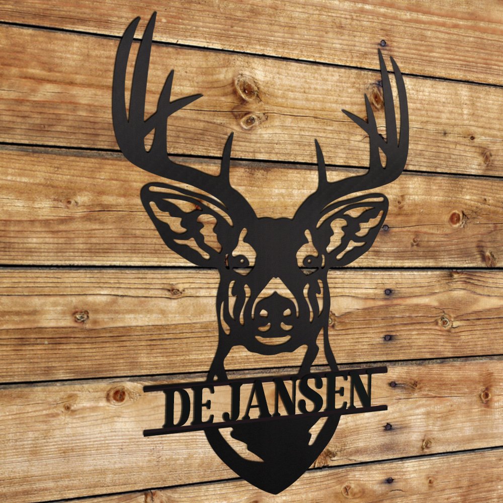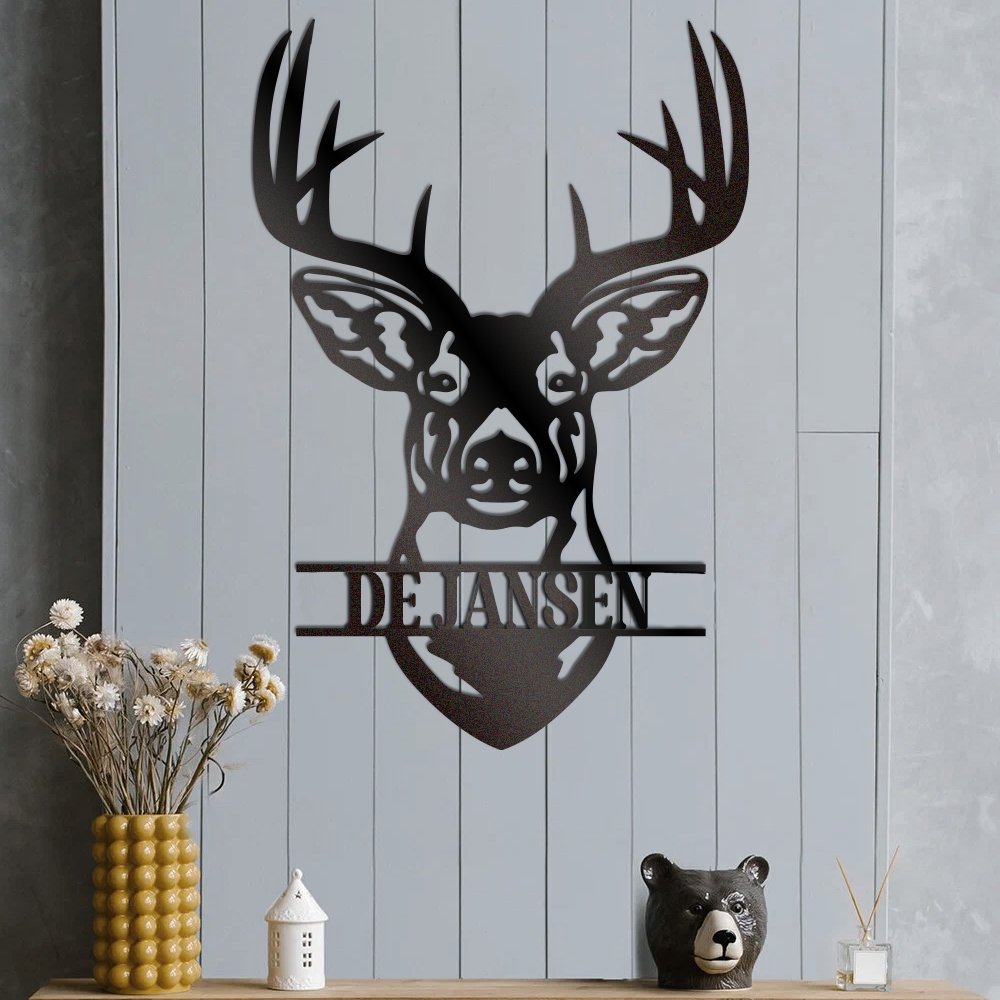 Dit metalen bord toont een uniek hertenkopontwerp met prachtig gedetailleerd gewei, waardoor het een opvallend middelpunt in elke kamer vormt. Het persoonlijke tintje door een naam aan het bord toe te voegen maakt het echt uniek en speciaal voor de ontvanger. Of u nu uw familienaam, een speciaal woord of een betekenisvolle datum wilt weergeven, het maatwerk voegt een persoonlijk tintje toe. De naam wordt vakkundig in het metaal gesneden en voegt een extra laag detail toe aan het ontwerp.