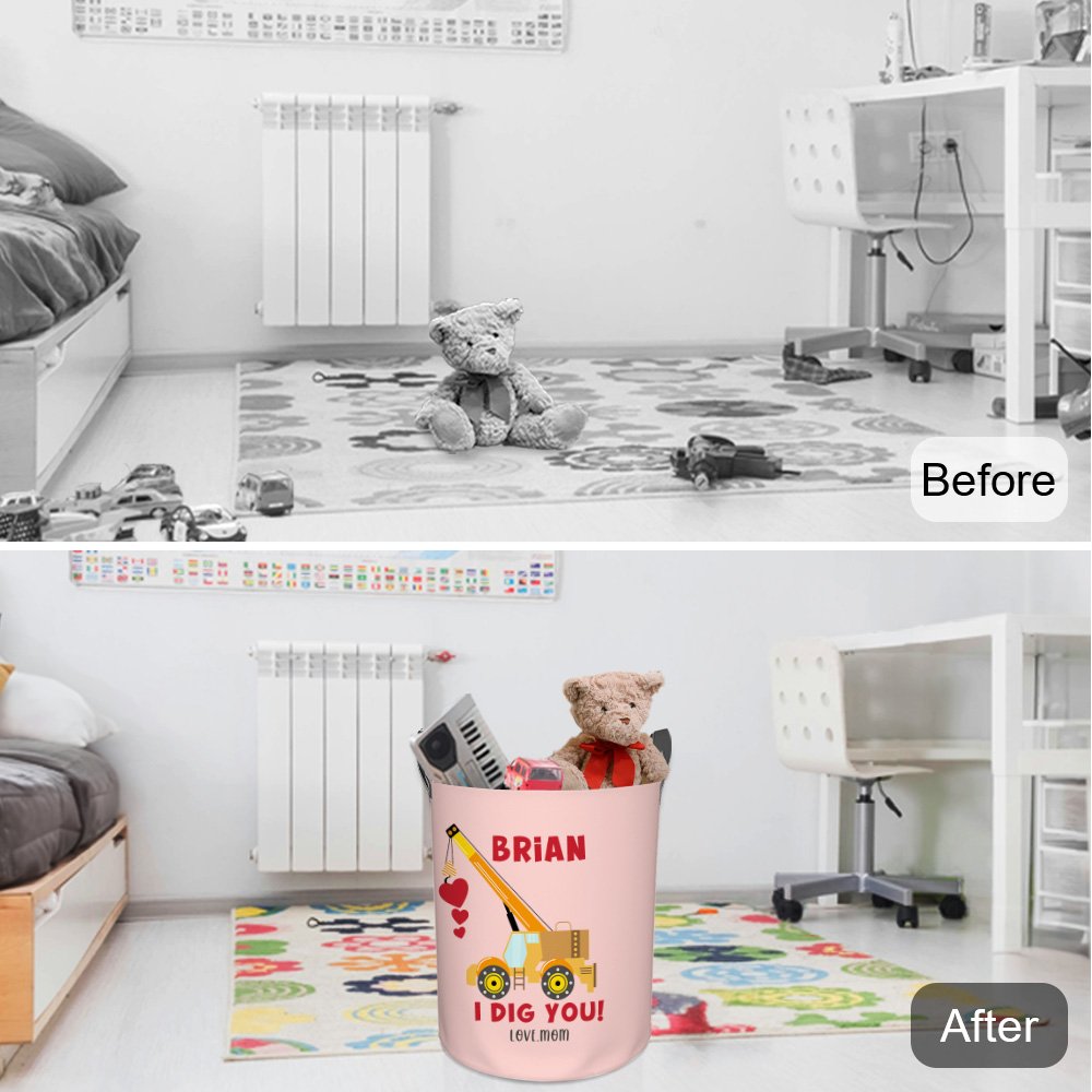De mand met vuile kleren is ontworpen met speelgoedauto-elementen zoals vrachtwagens en graafmachines, met de woorden "We Dig You, I Digh You" om een beetje plezier toe te voegen. Hij is verkrijgbaar in verschillende kleuren en de naam en tekst kunnen worden aangepast aan verschillende huisstijlen.