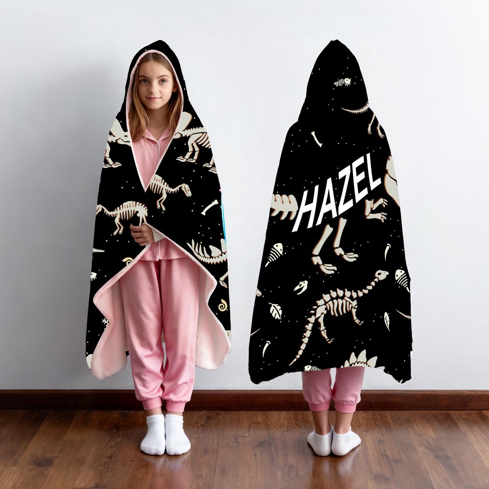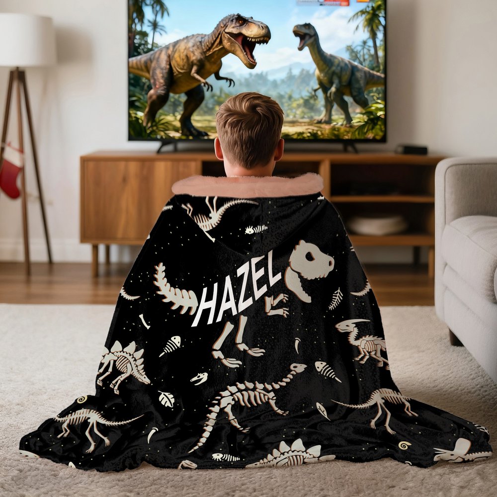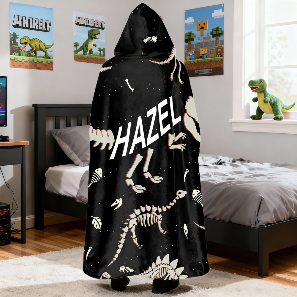 Onze capuchondeken is geïnspireerd op de mystiek van dinosaurusfossielen, met levendige skeletpatronen die de aandacht van kinderen trekken en hun fascinatie voor de prehistorische wereld aanwakkeren. In combinatie met onze optie om de naam aan te passen, kunnen gebruikers een magische band met het tijdperk van de dinosaurussen ervaren terwijl ze warm en comfortabel blijven, waardoor elk gebruik aanvoelt als een intieme ontmoeting met oude wezens.