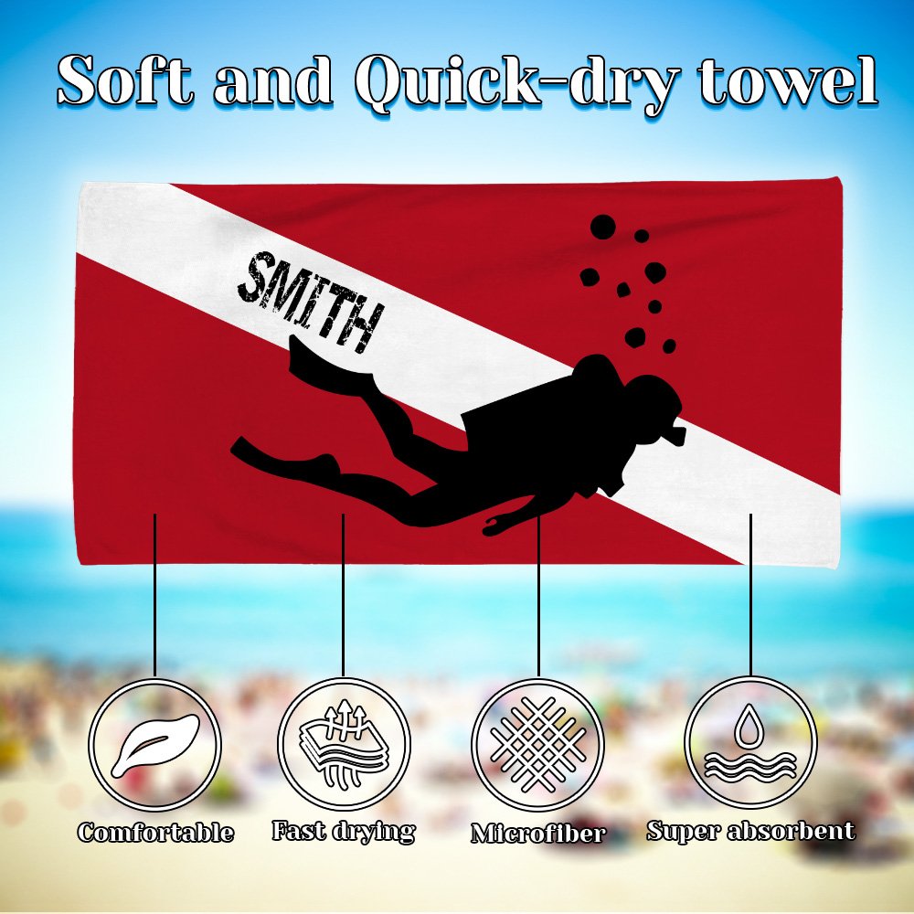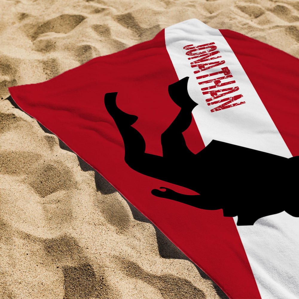 Onze strandlakens hebben de kleuren van de rode en witte duikvlag die veiligheid en bewustzijn symboliseren en zijn voorzien van een vet silhouet van een duiker die avontuur en verkenning symboliseert en de essentie van diegenen die van de sensatie van de onderwaterwereld houden, vastlegt. Bovendien voegt de optie om tekst te personaliseren een uniek tintje toe, waardoor elk strandlaken een uniek stuk wordt dat de persoonlijkheid van de gebruiker weerspiegelt.