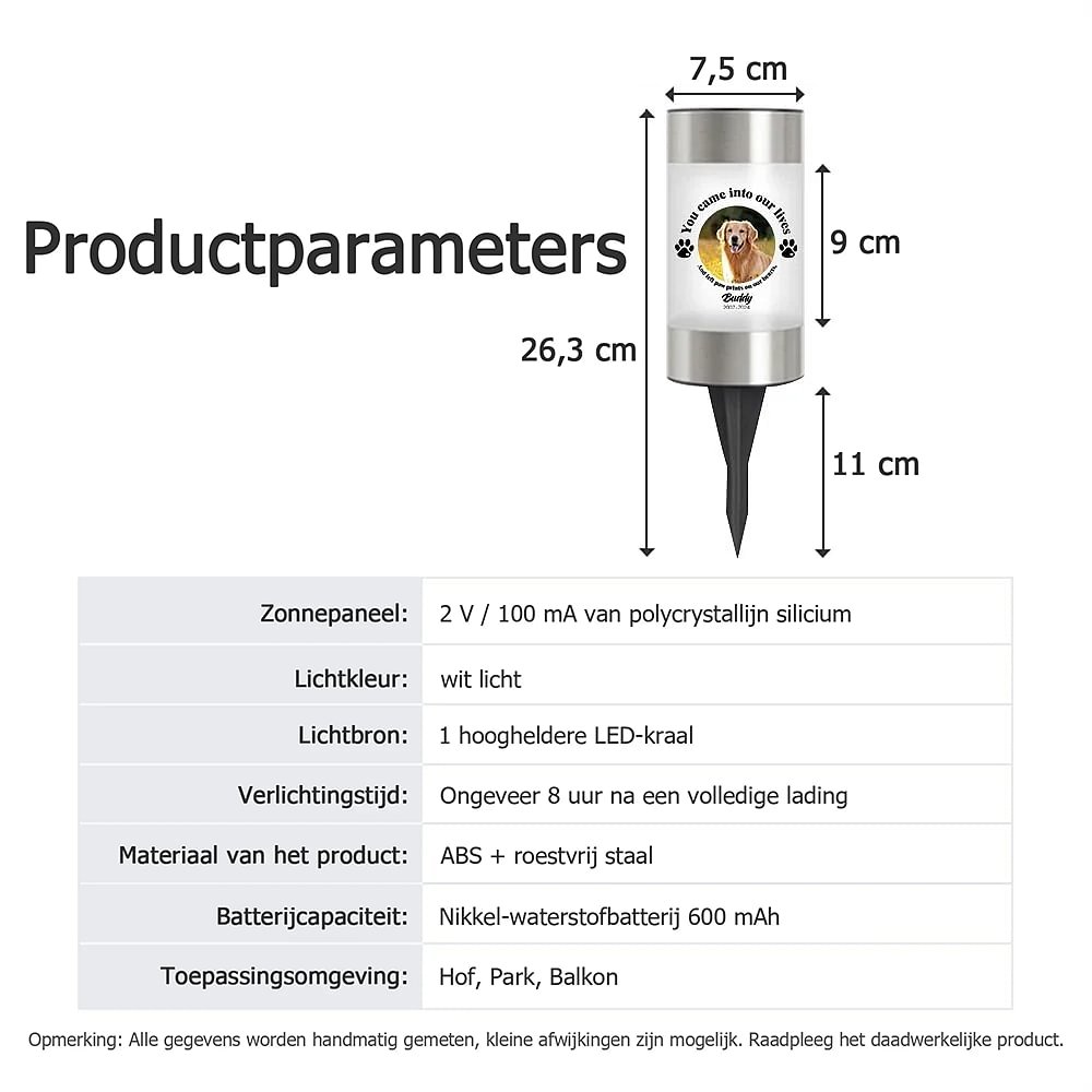 Deze lamp is gemaakt met een geavanceerd drukproces dat bestand is tegen diverse weersomstandigheden, waardoor hij lang meegaat. De schoonheid en functionaliteit blijven behouden, ongeacht wind, regen of direct zonlicht, waardoor het een blijvend eerbetoon vormt aan je dierbare huisdier.