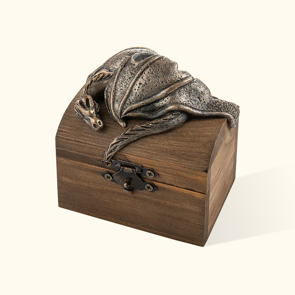 A treasure chest-shaped ring box with a dragon nestled in it. From its appearance, it looks like a giant dragon guarding the treasure chest. The contents of this treasure chest are very precious. You can personalize the name of the recipient on the treasure chest and give this unique gift to your precious one!
