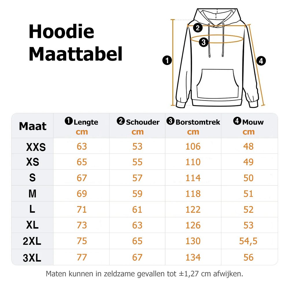 | Afmetingen: | Sweater - XXS, XS, S, M, L, XL, 2XL, 3XL Hoodie - XXS, XS, S, M, L, XL, 2XL, 3XL |